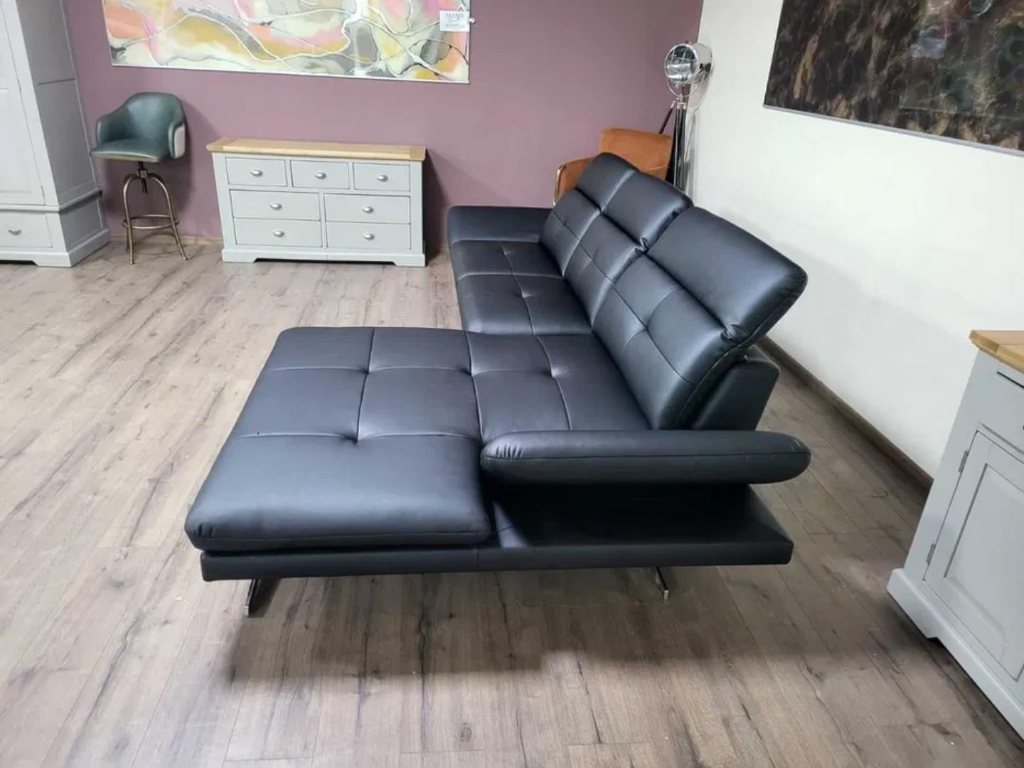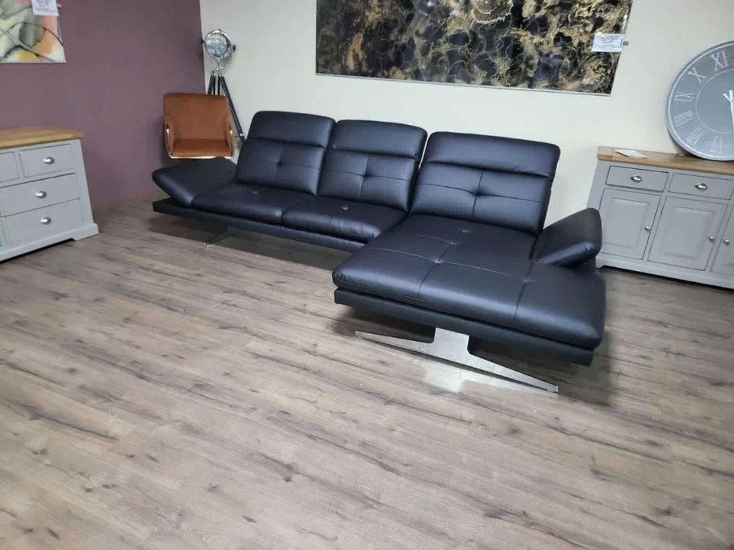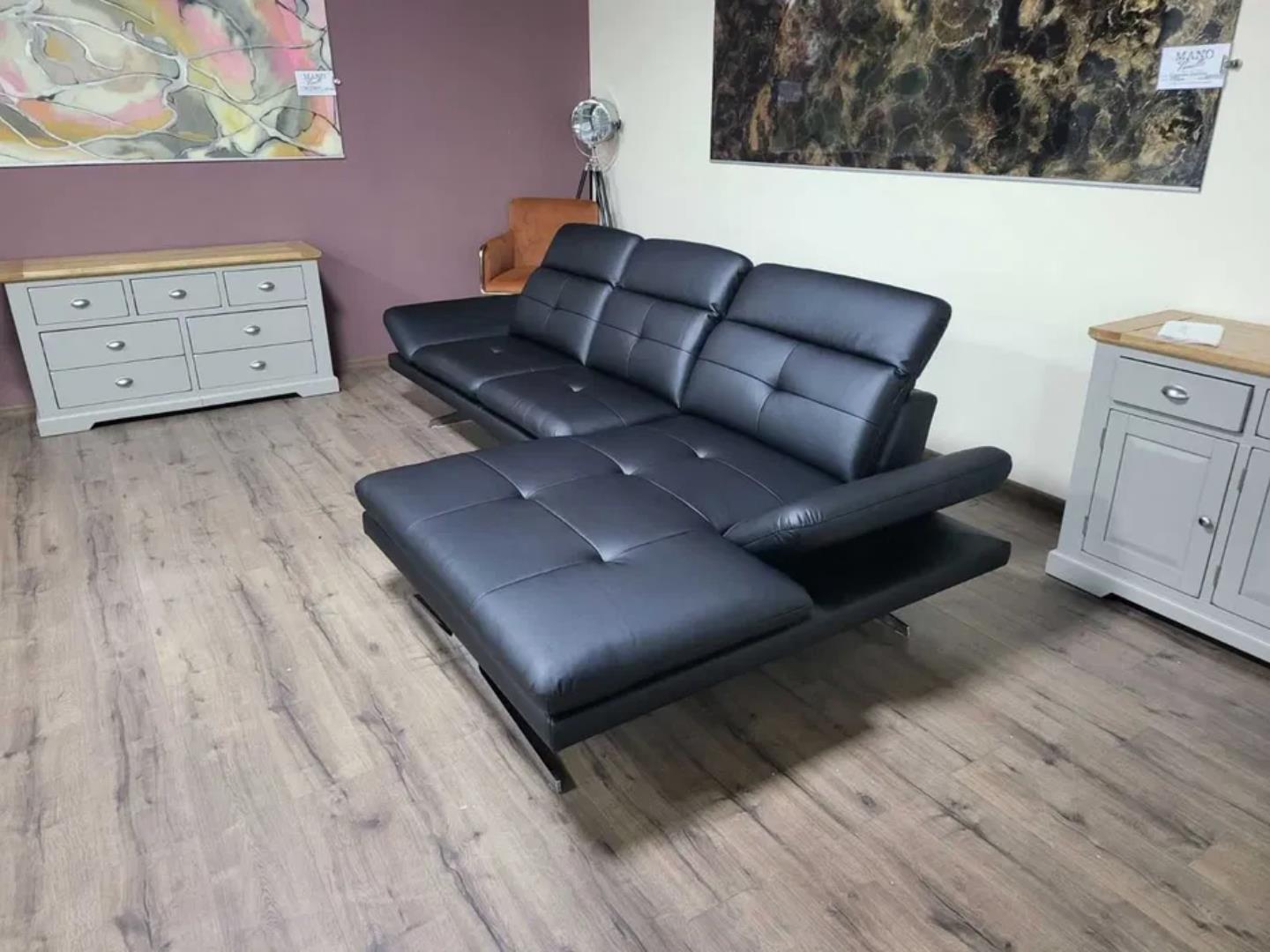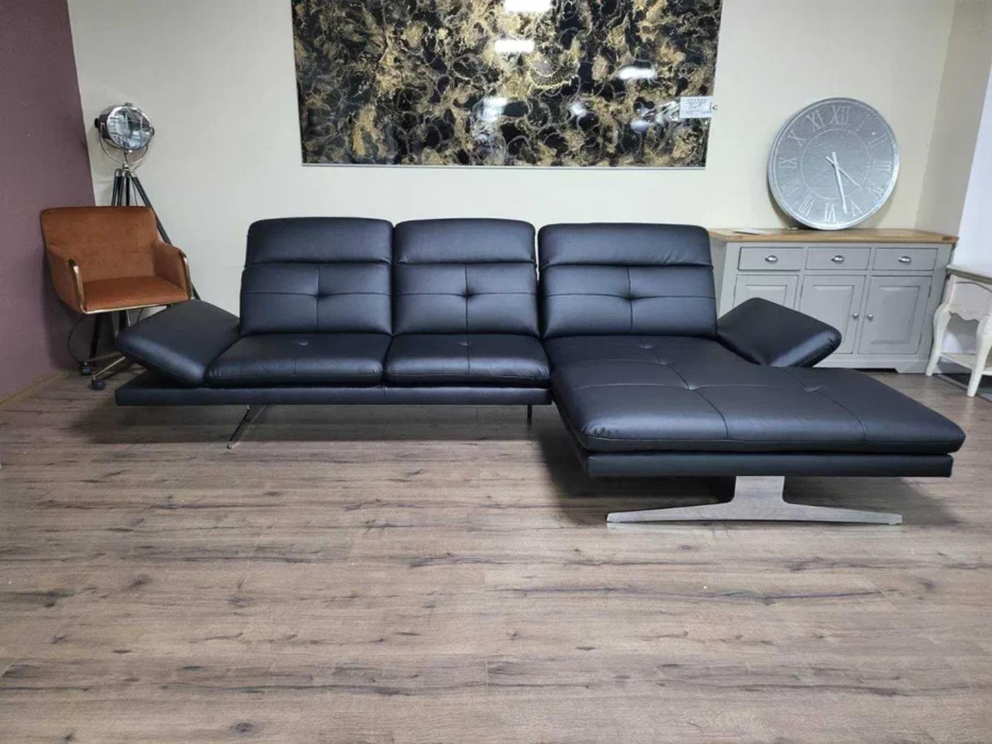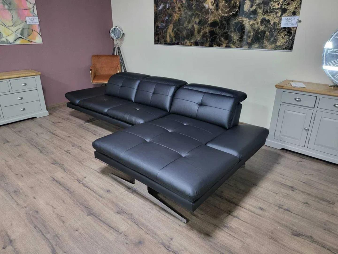 Черен кожен ъглов диван „DANA“ с подвижни облегалки и подлакътници.