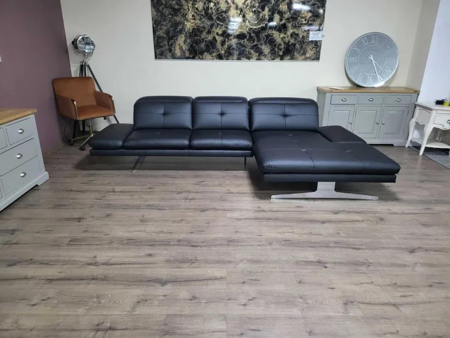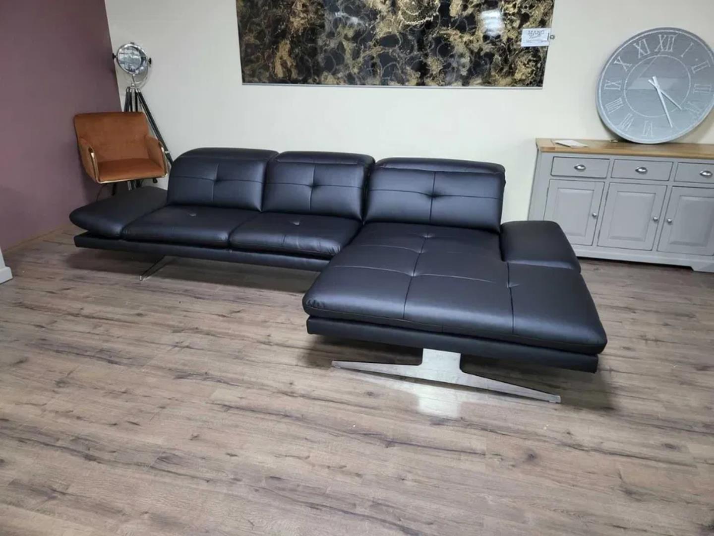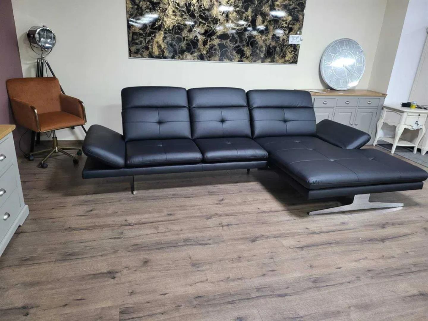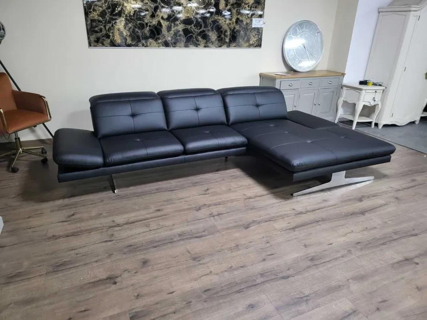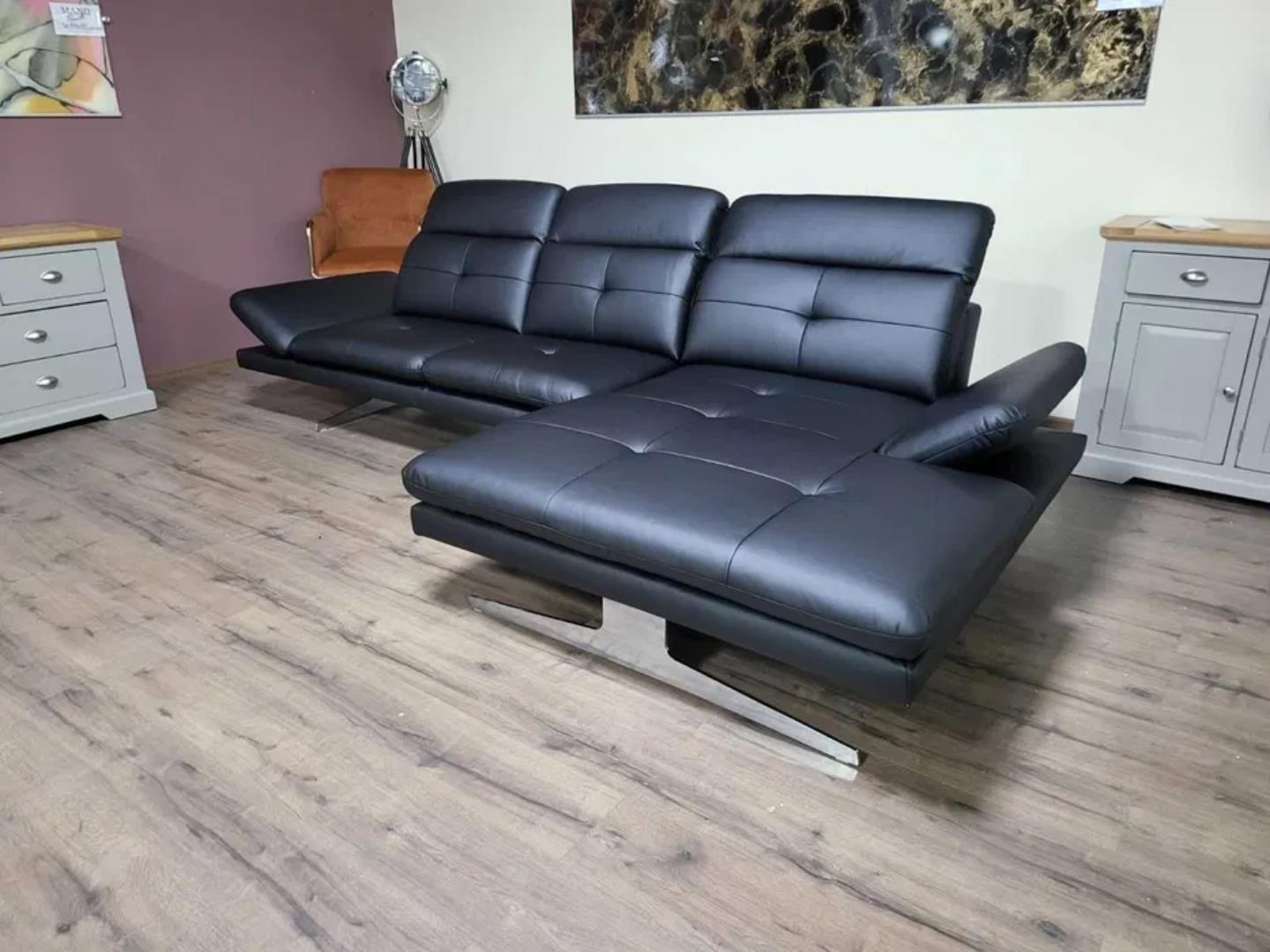Черен кожен ъглов диван „DANA“ с подвижни облегалки и подлакътници.