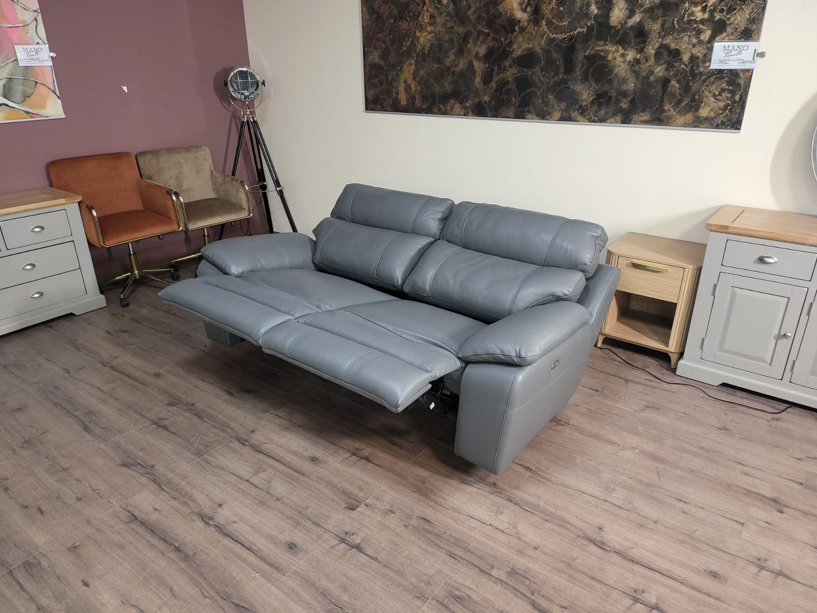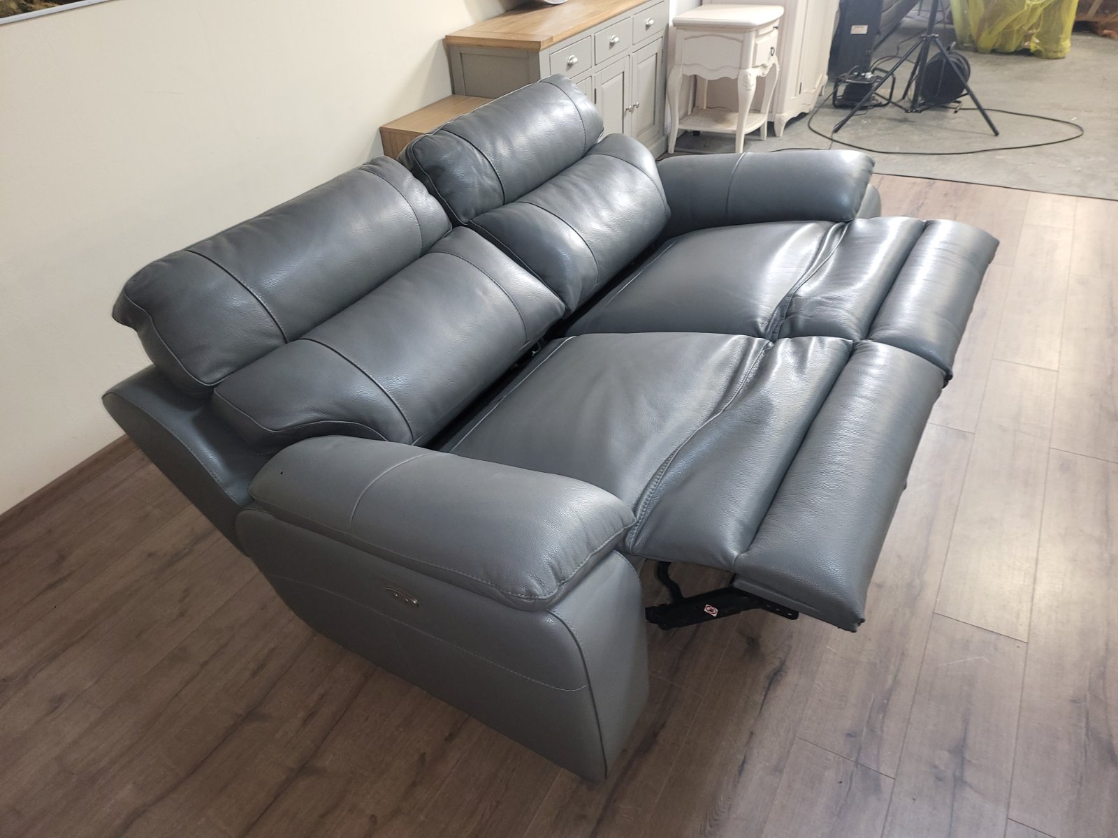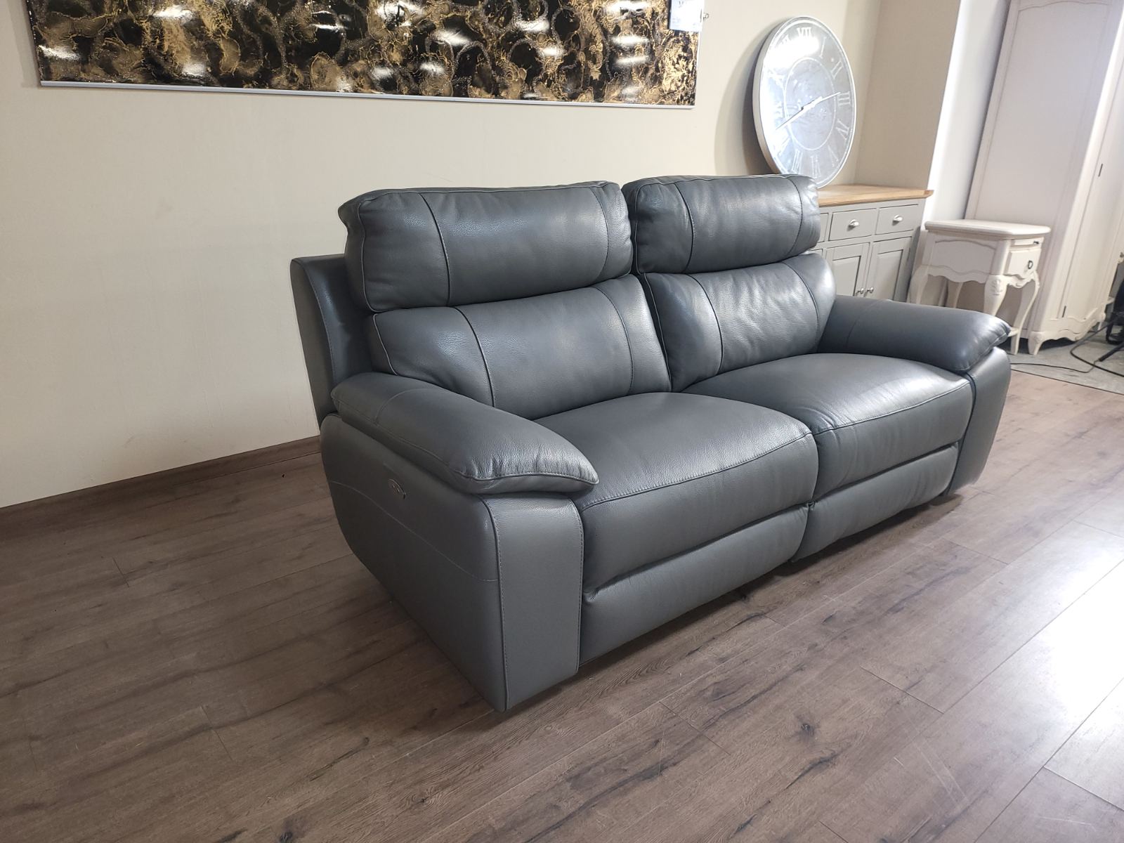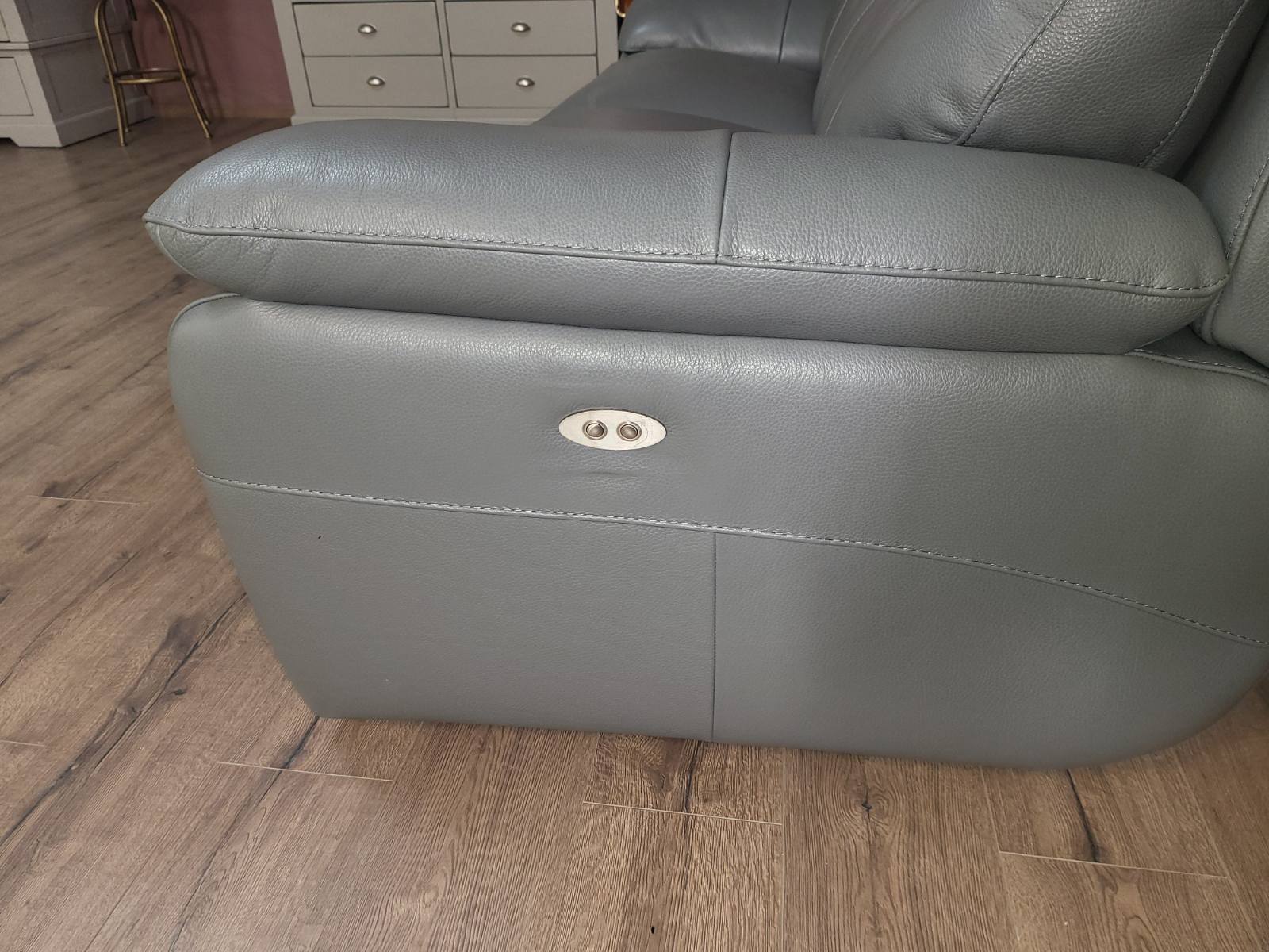 Италиански сив кожен диван тройка Lorenzo с електрически релаксиращ механизъм за краката.
