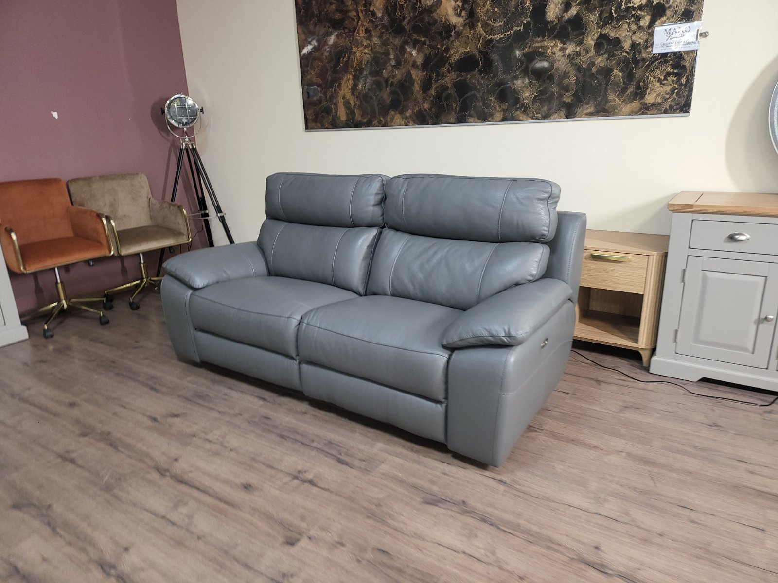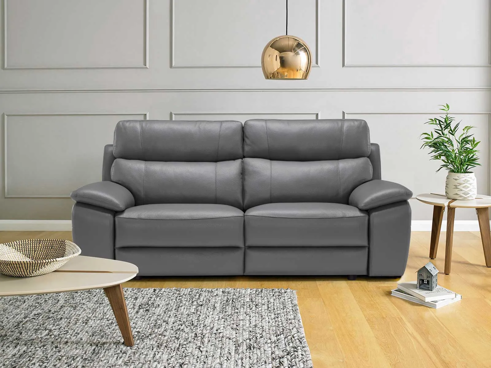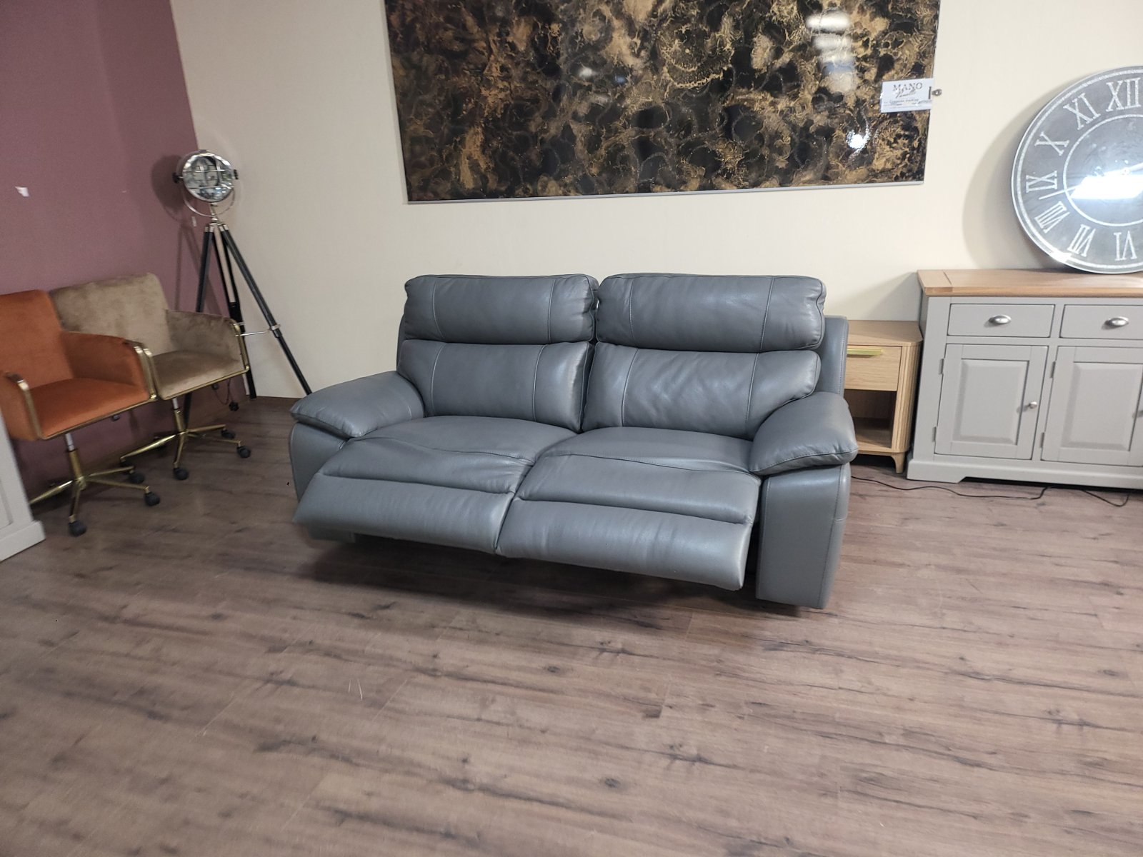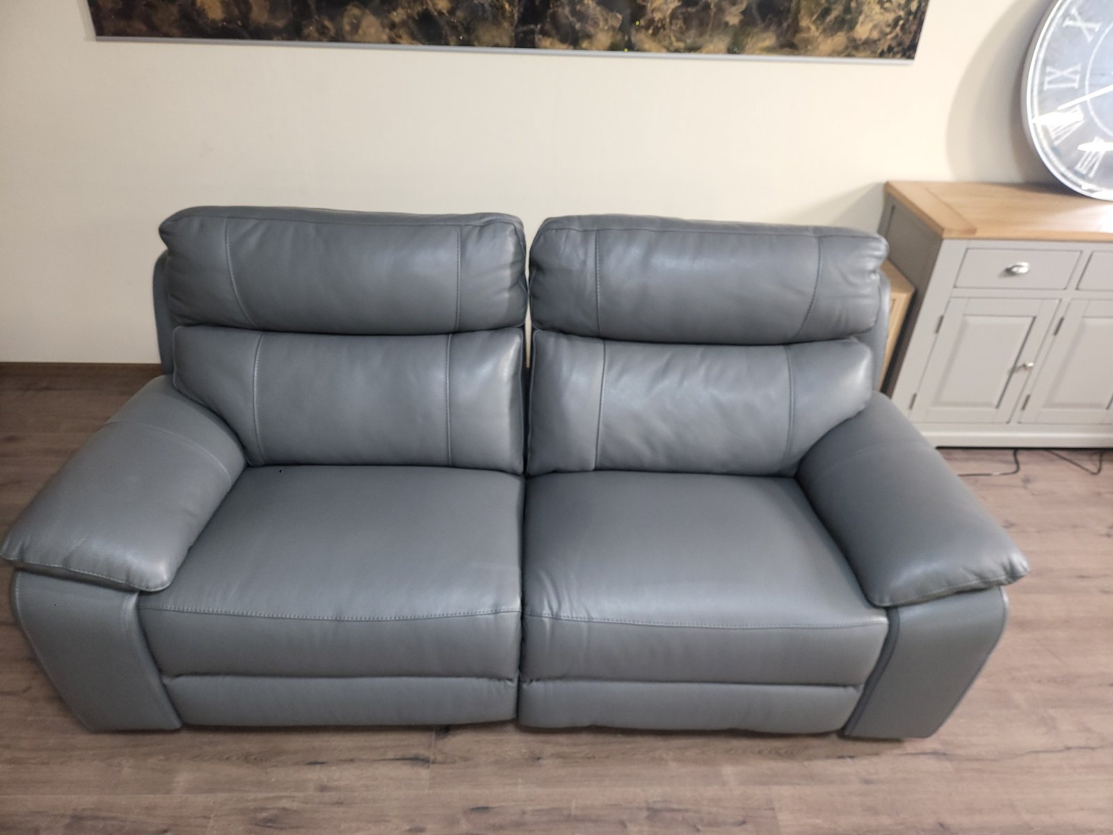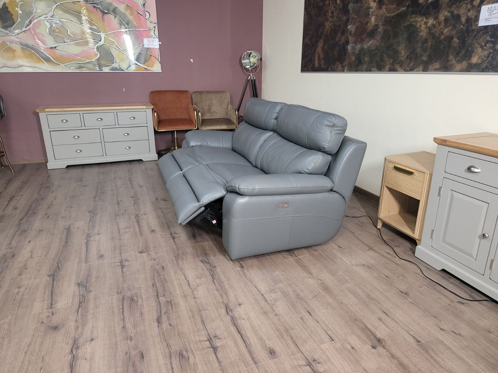 Италиански сив кожен диван тройка Lorenzo с електрически релаксиращ механизъм за краката.