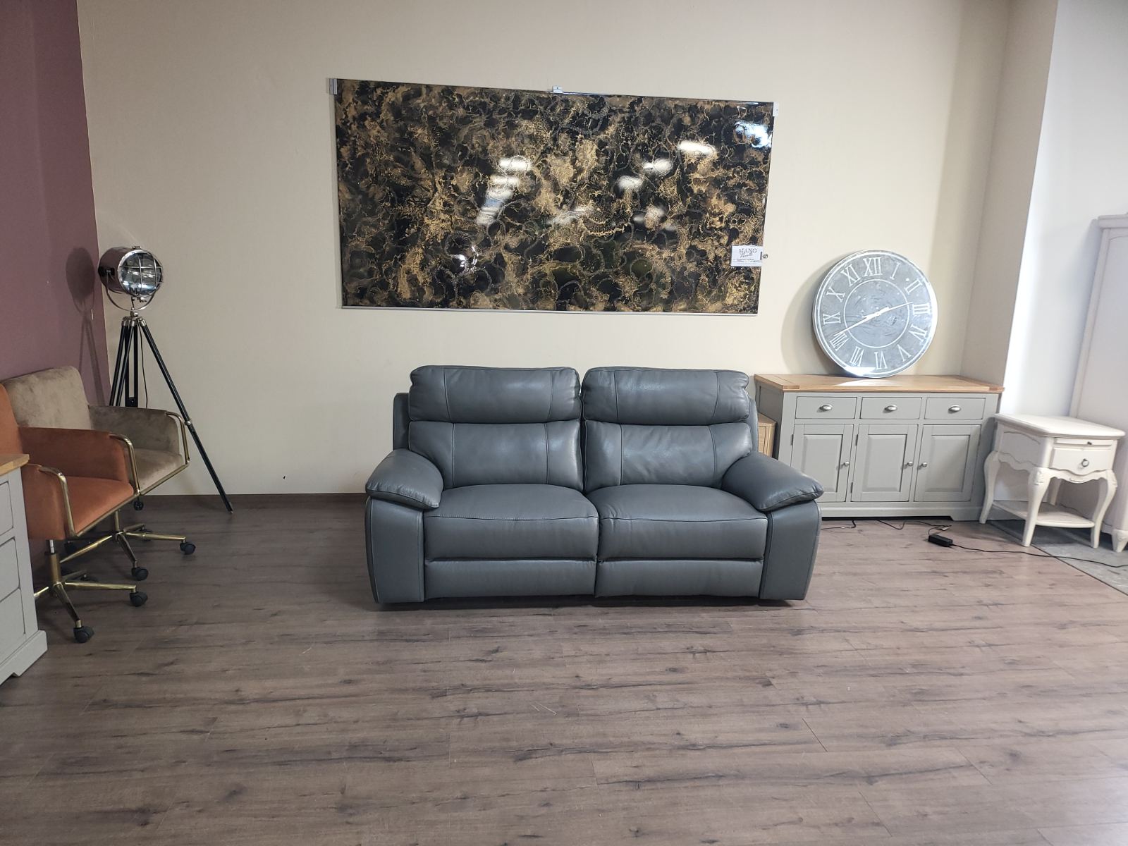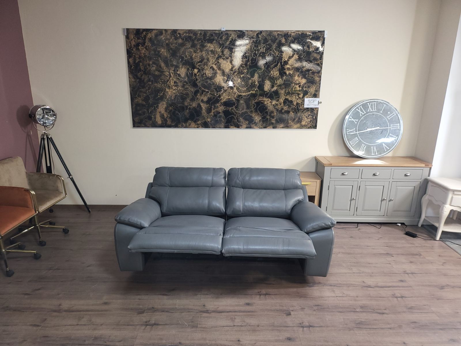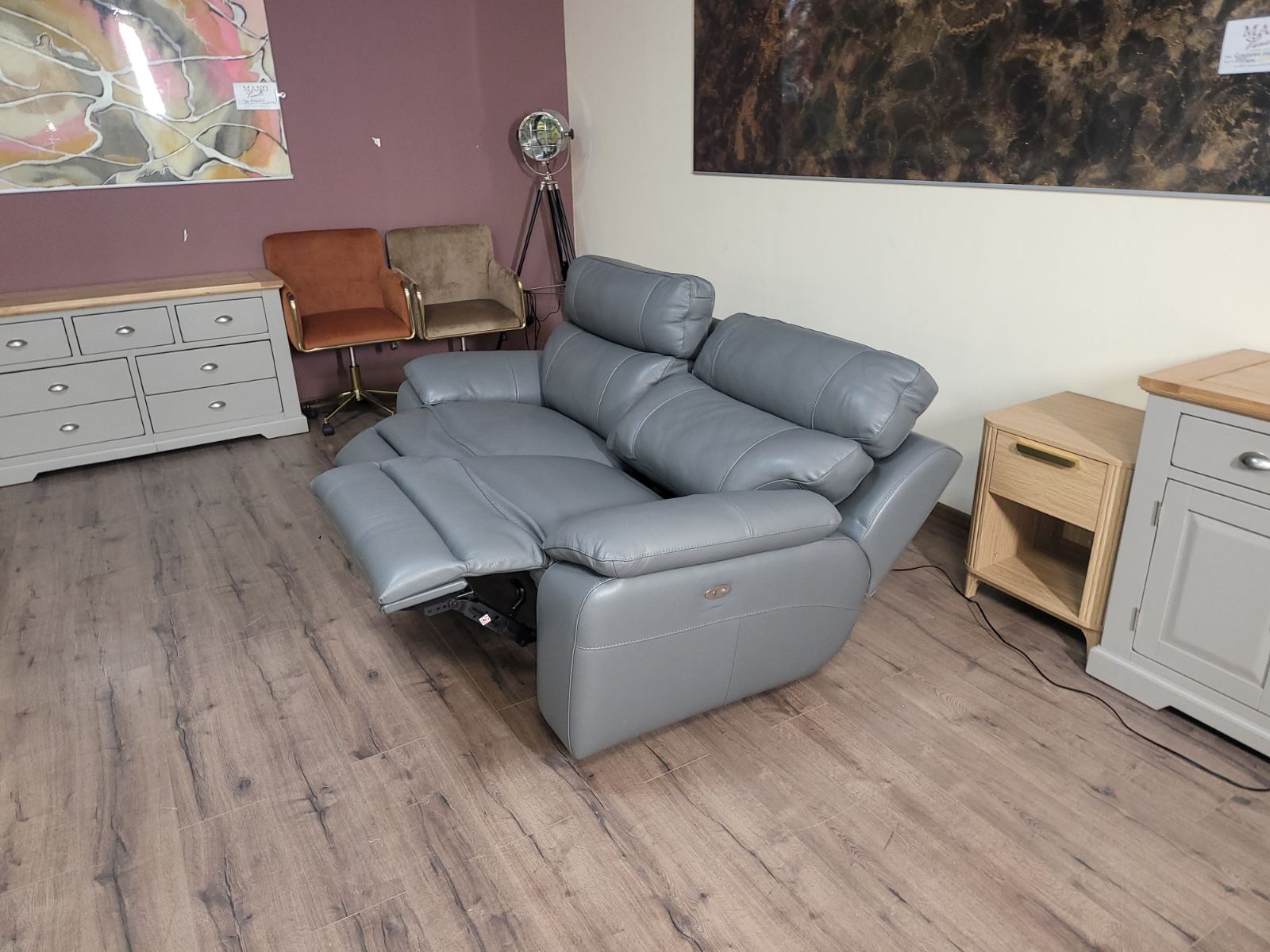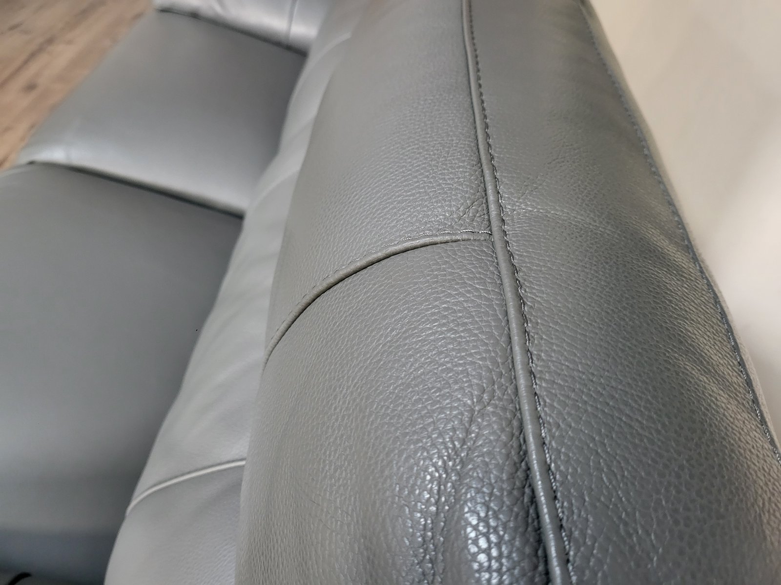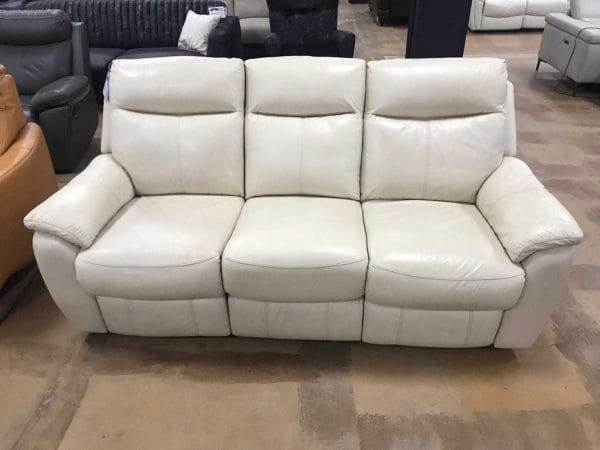 Италиански сив кожен диван тройка Lorenzo с електрически релаксиращ механизъм за краката.