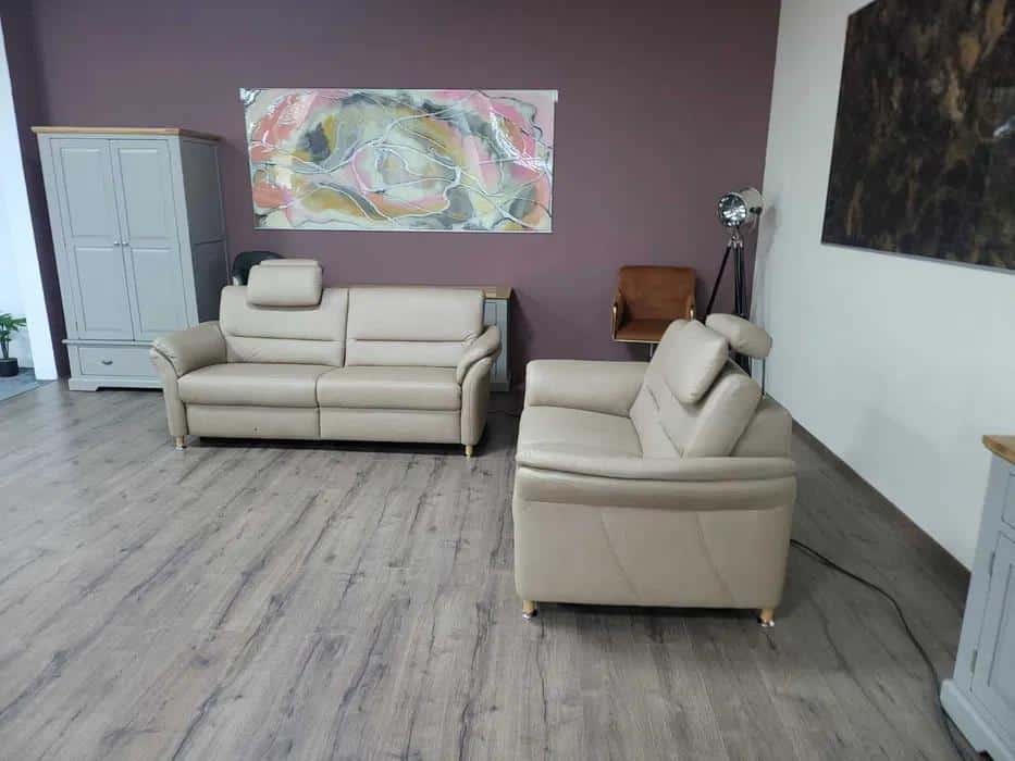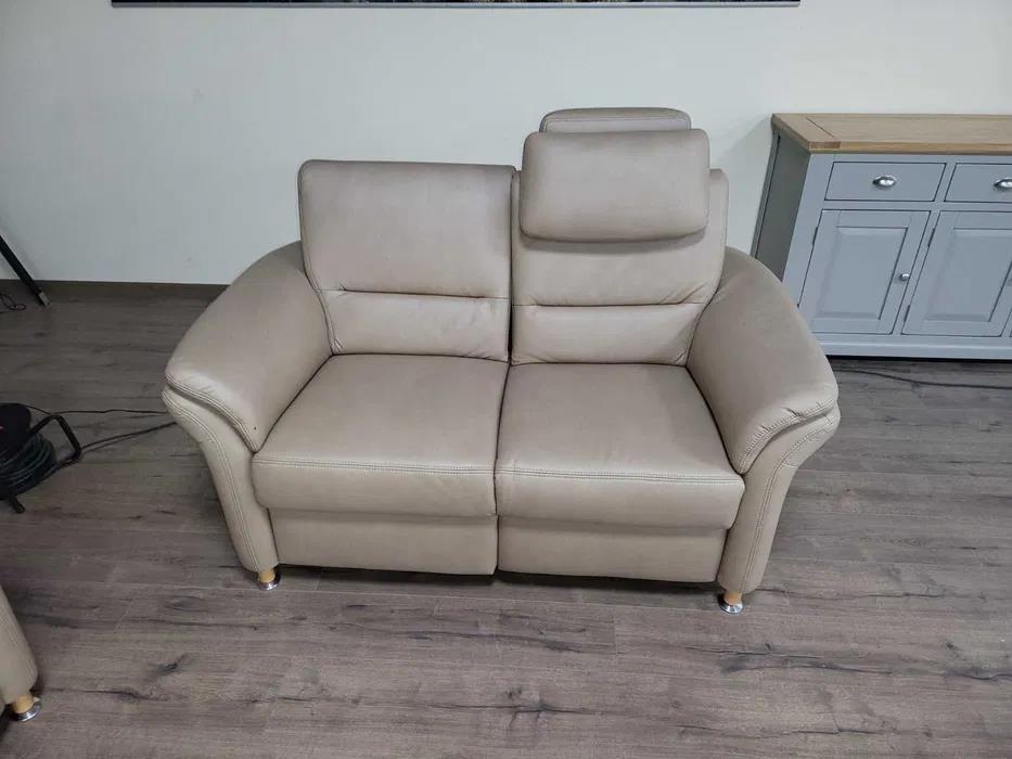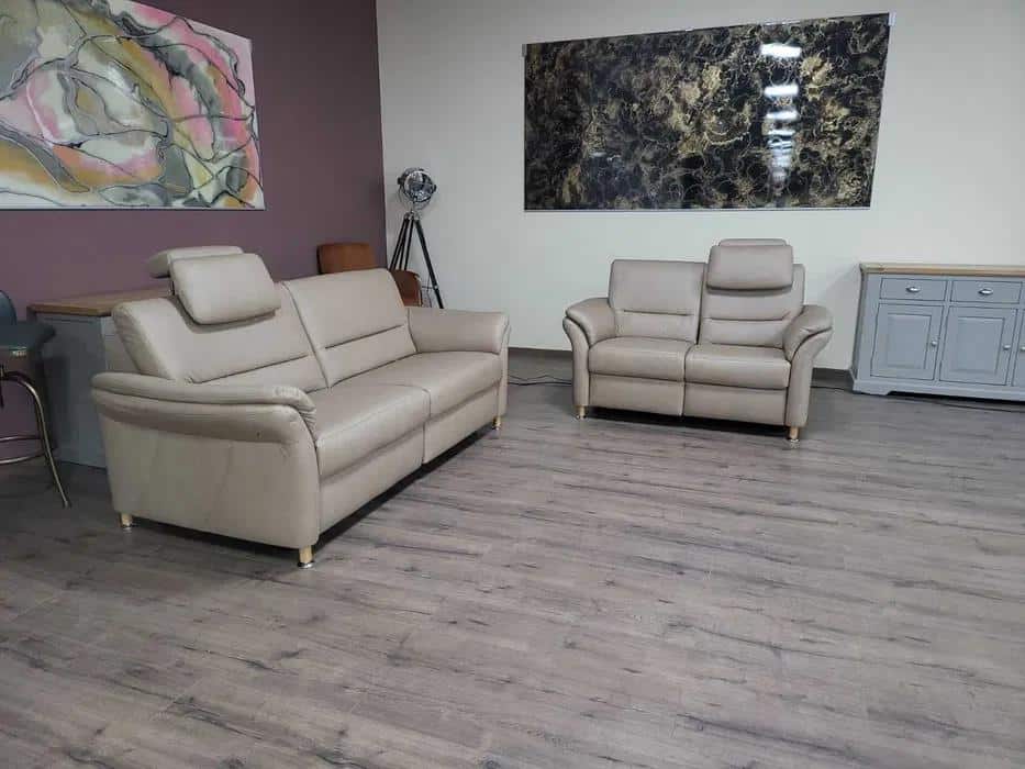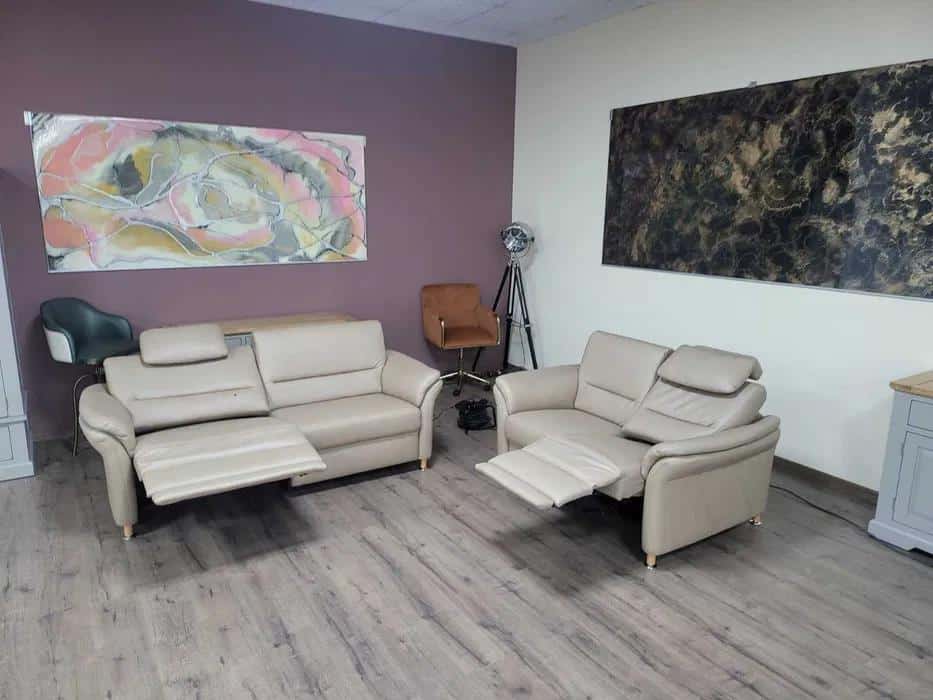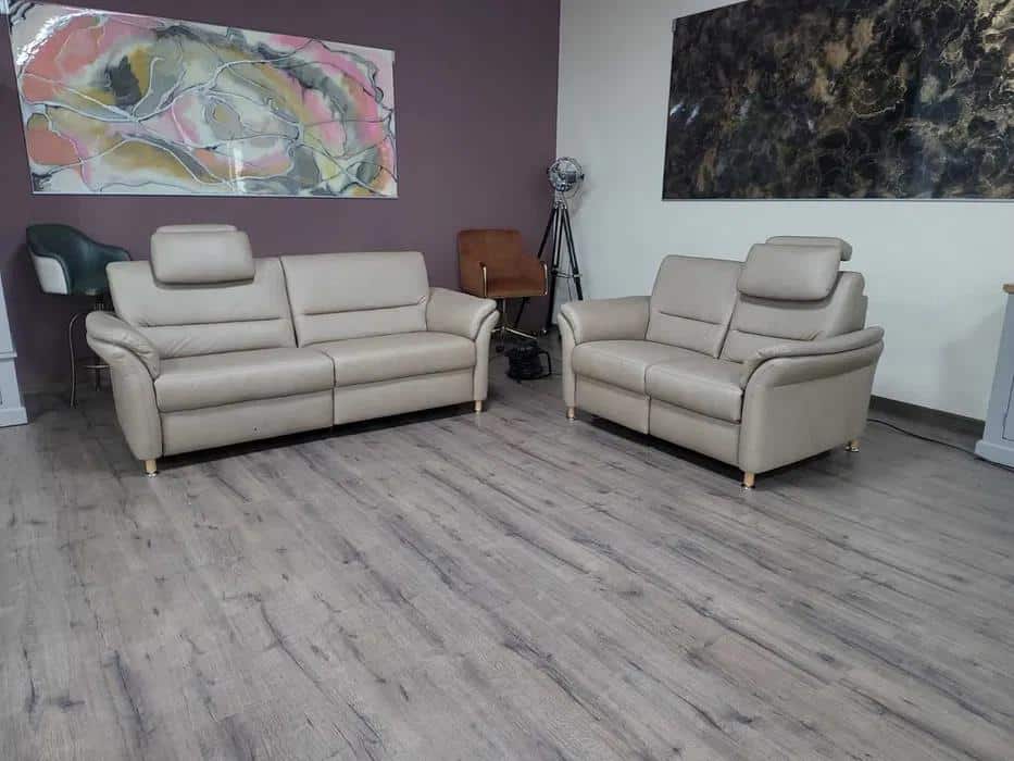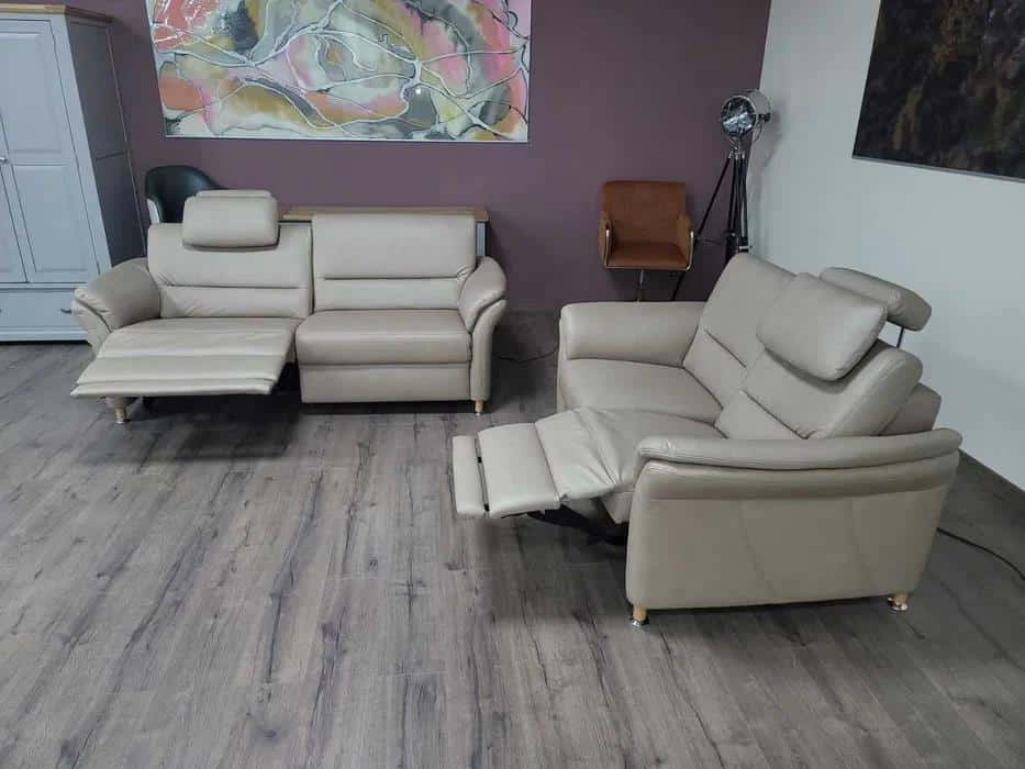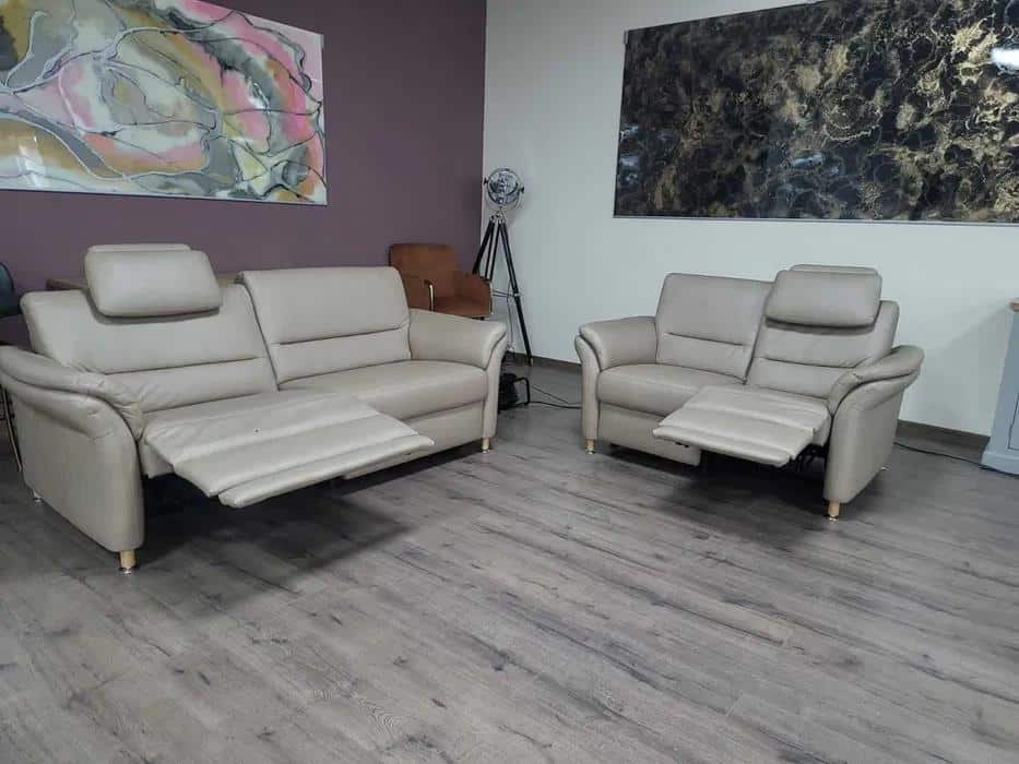 Комплект кожени дивани тройка и двойка цвят камел с по един електрически релаксиращ механизъм за краката на всеки диван – 100 % естествена кожа.