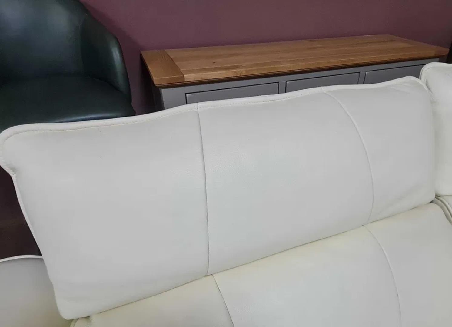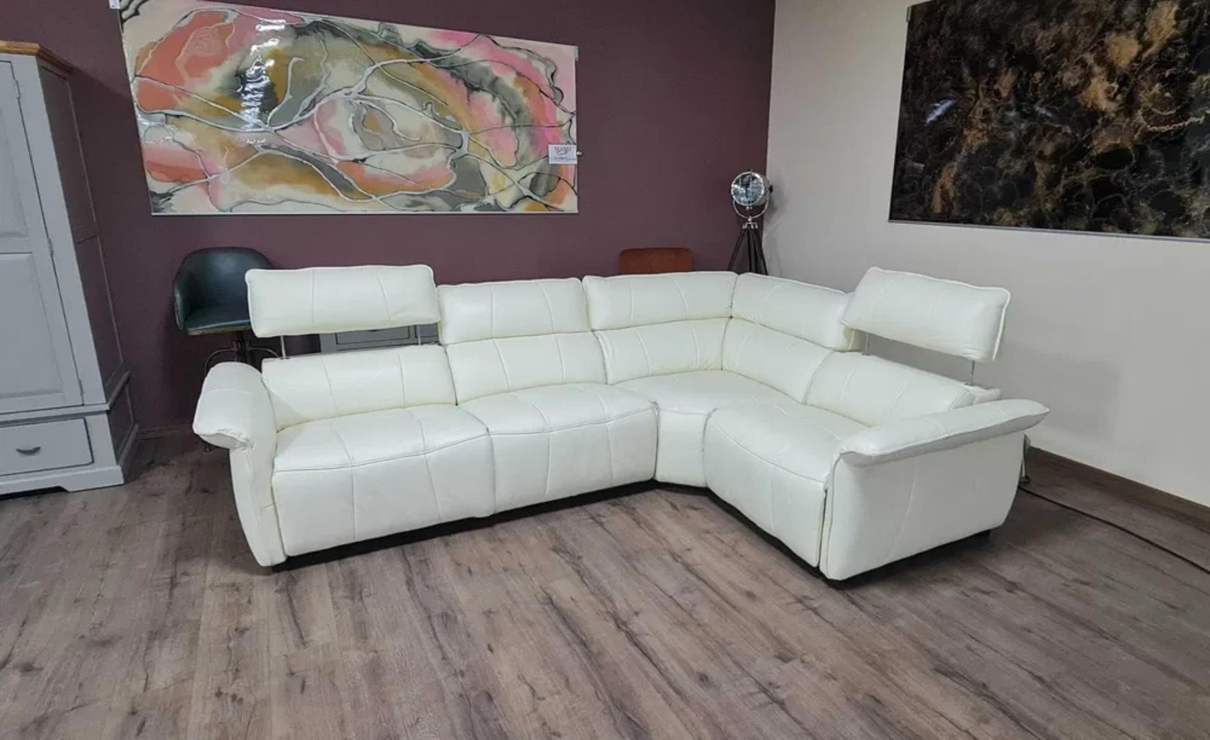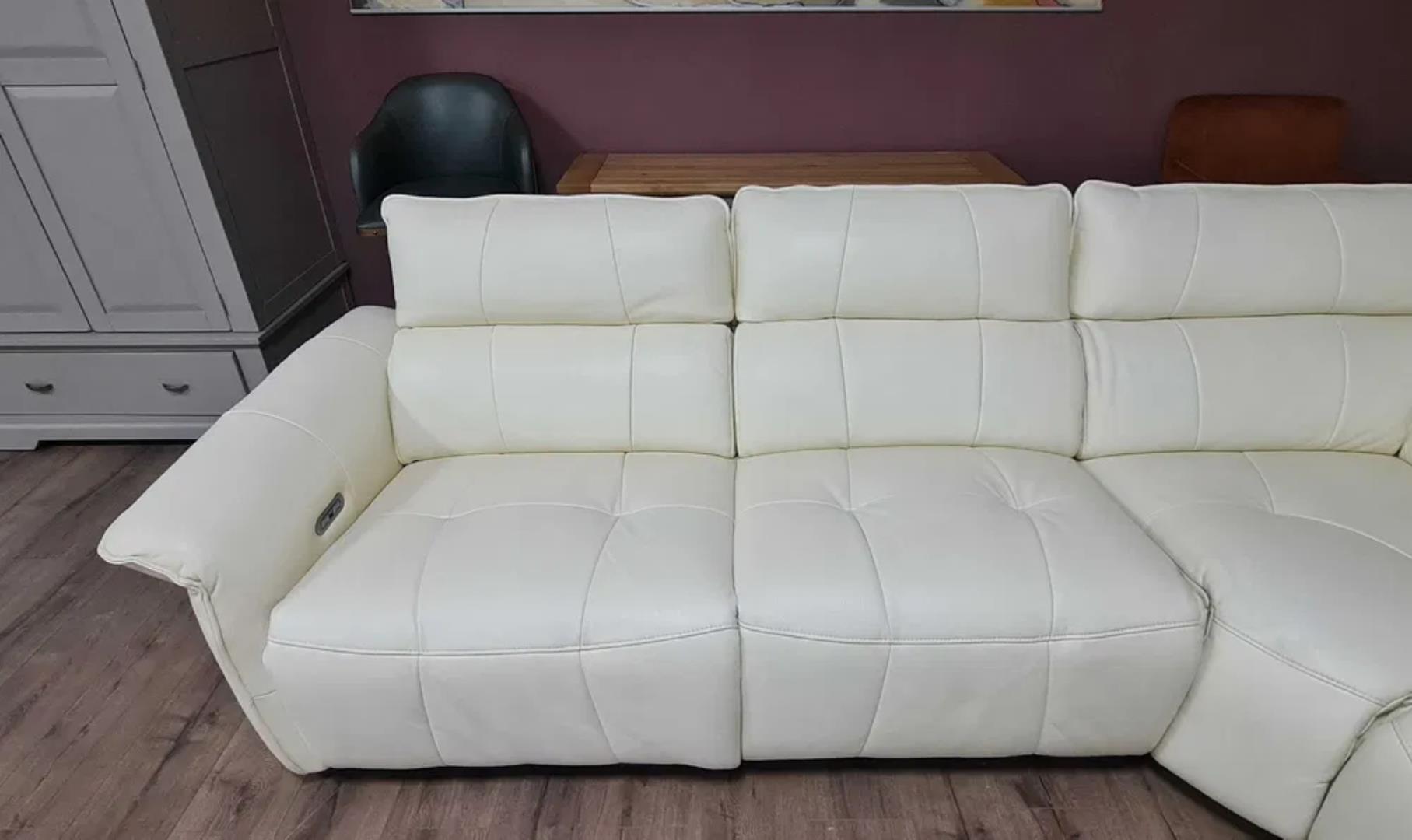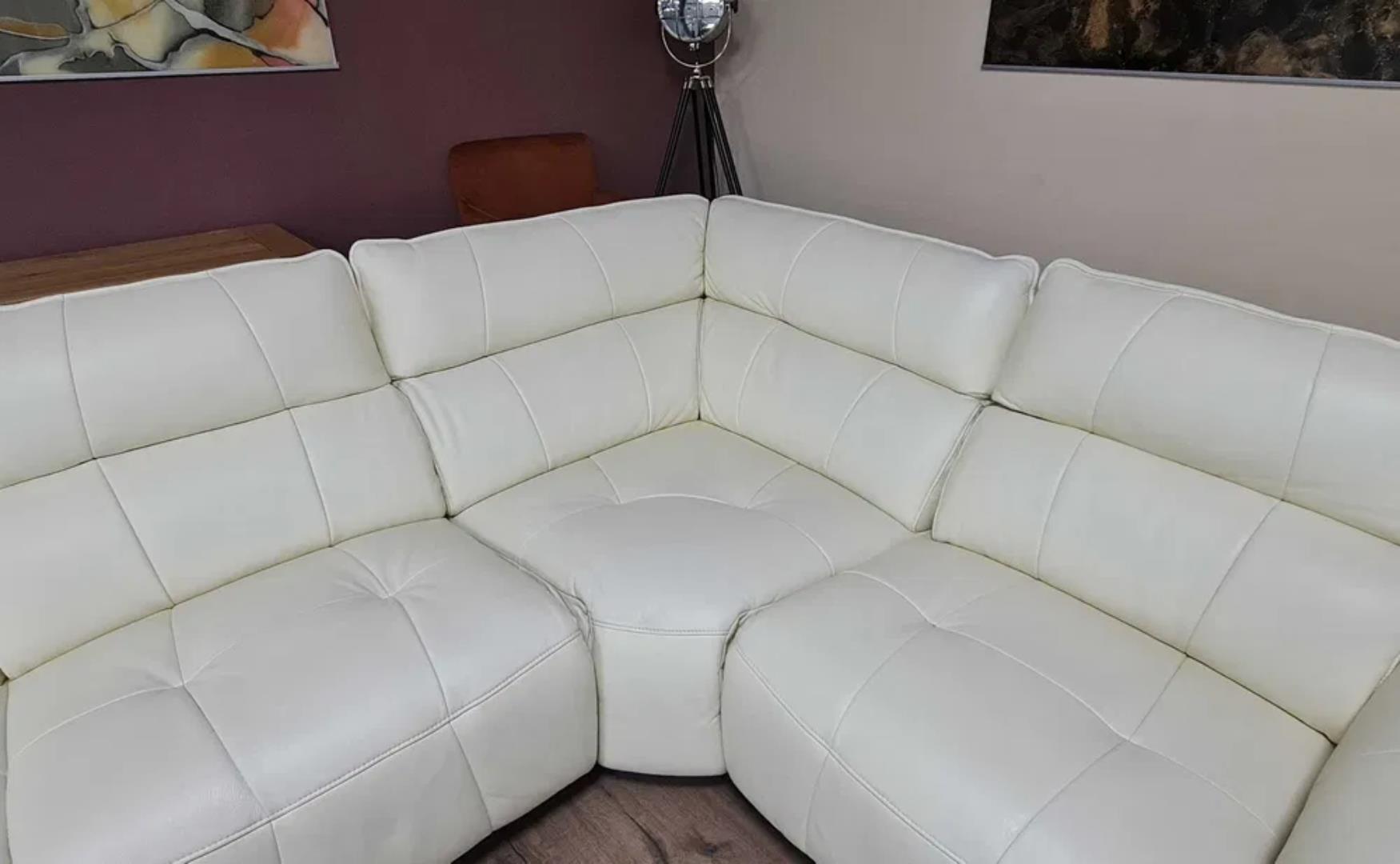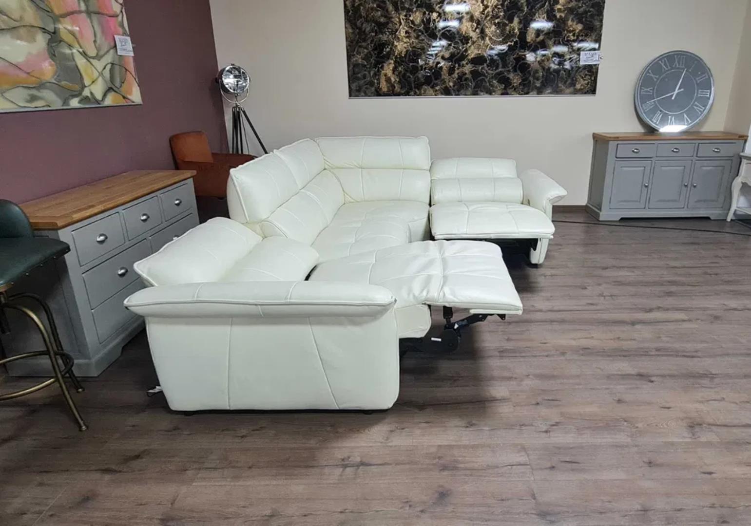 Кремав кожен ъглов диван „Cadenza“ с електрически релакиращ механизъм за краката и облегалките на двете крайни седалки – 100 % естествена кожа.