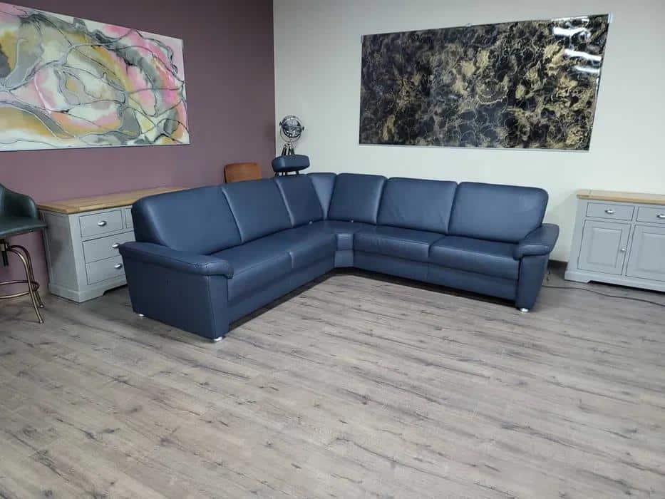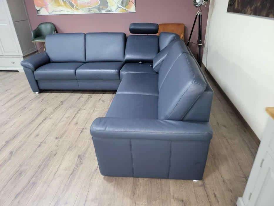 Син кожен ъглов диван Vercelli Belvita. Двете облегалки на ъгловото парче са подвижни – 100 % естествена кожа.