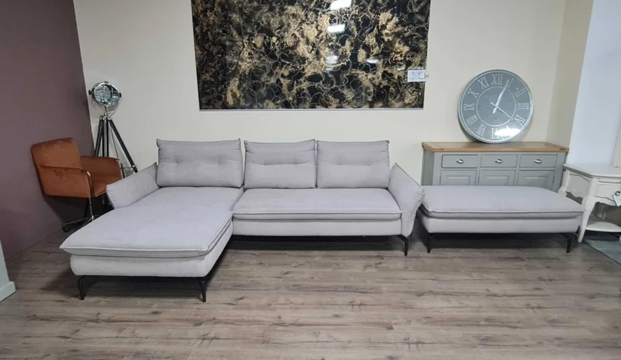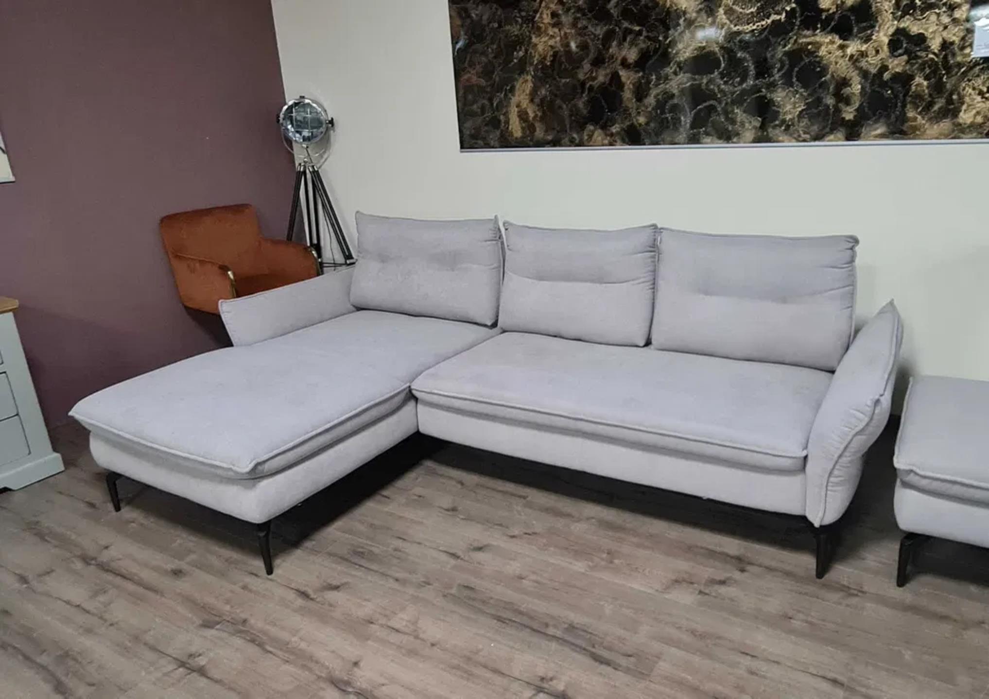 Сив ъглов диван от плат и табуретка „Alexis“. Диванът е с подвижни облегалки. Може да се използва за спане, като се сложи табуретката пред дивана.