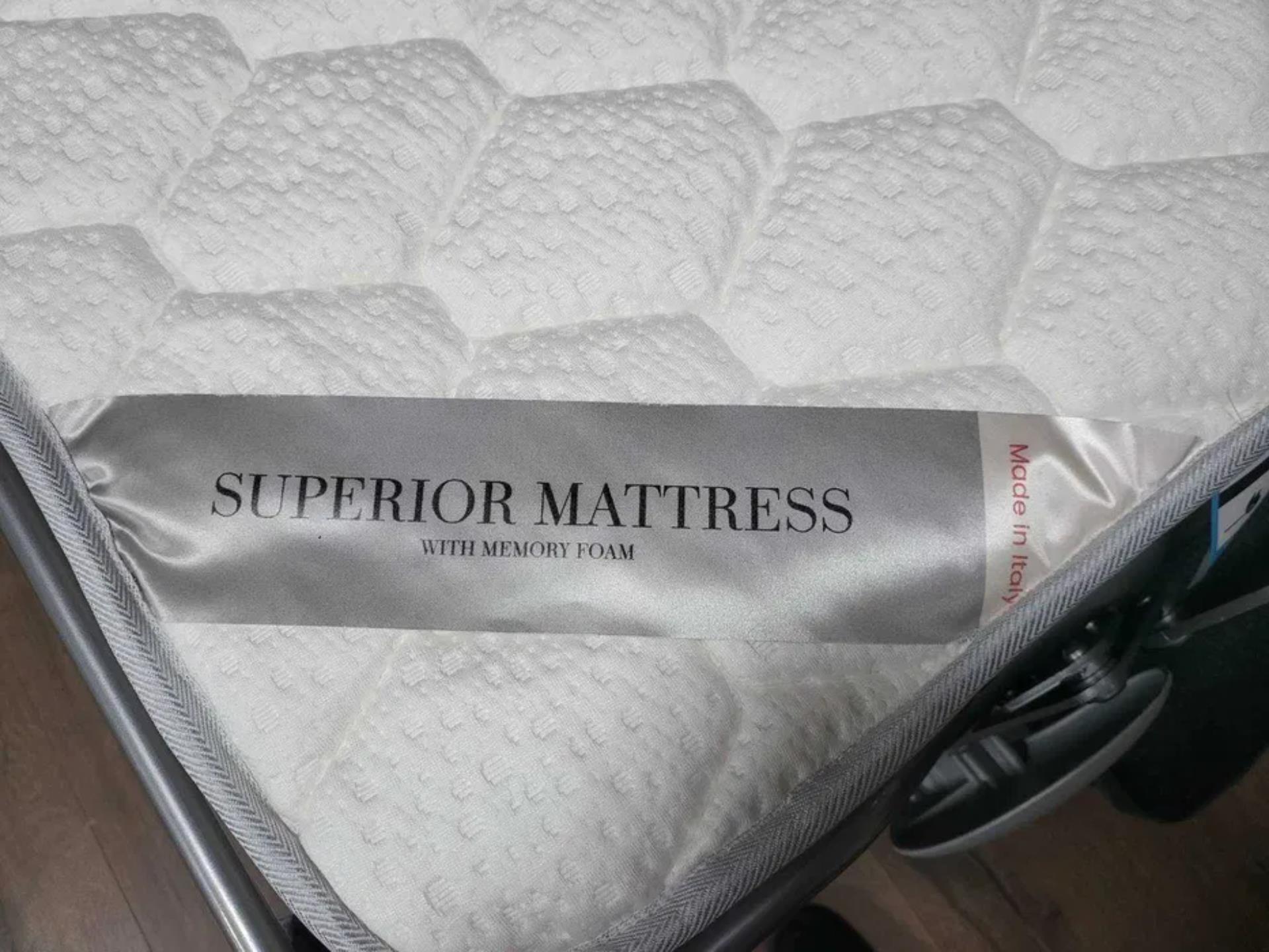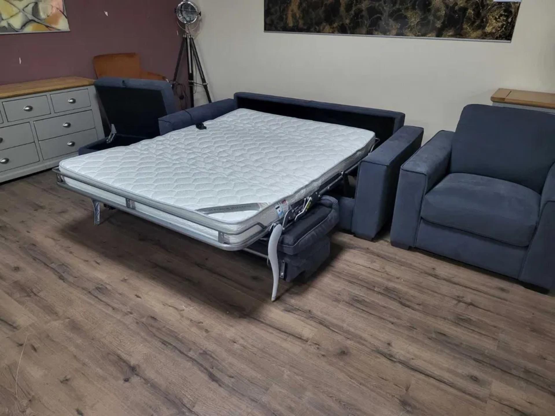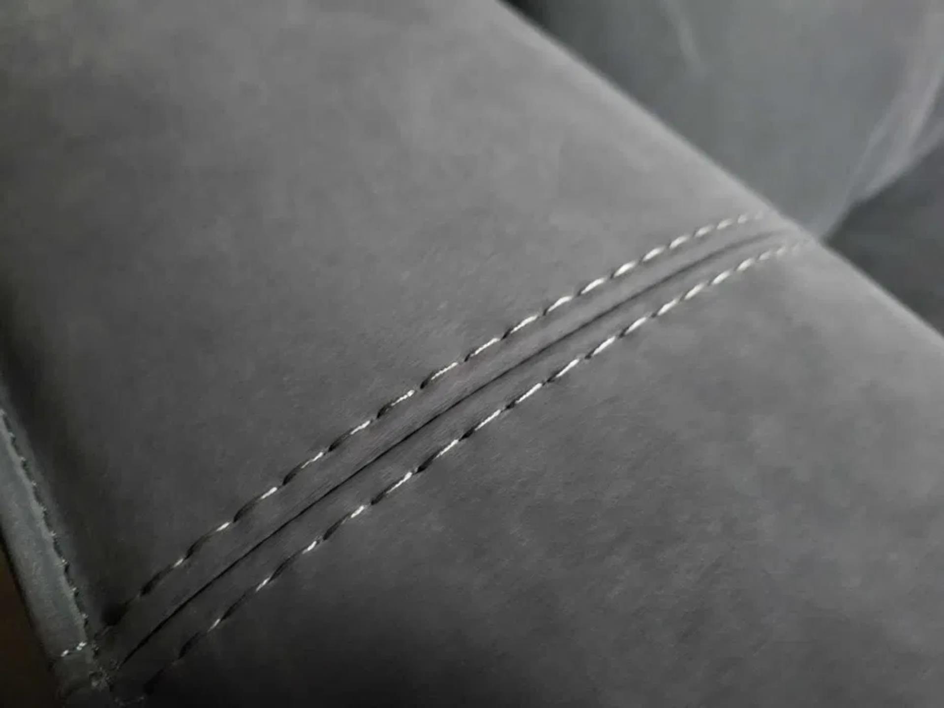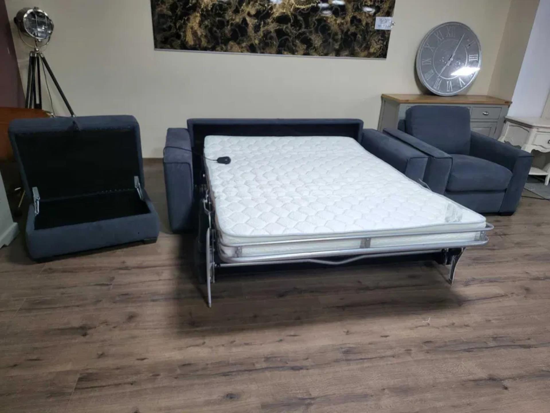 Сив комплект от плат диван тройка с функция сън, фотьойл и табуретка. Диванът е с фунция сън, като се отваря електрически с дистанционно. Табуретката е с функция ракла.