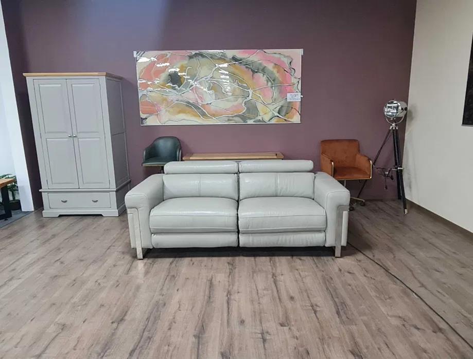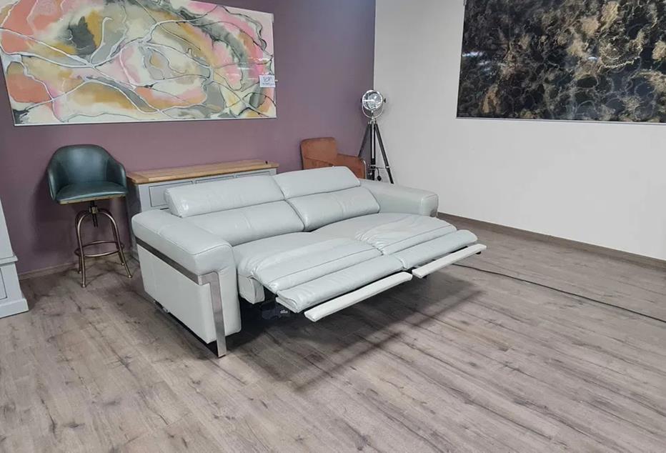 Сив кожен диван тройка „Moreno“ с електрически релаксиращ механизъм за краката и подвижни облегалки.