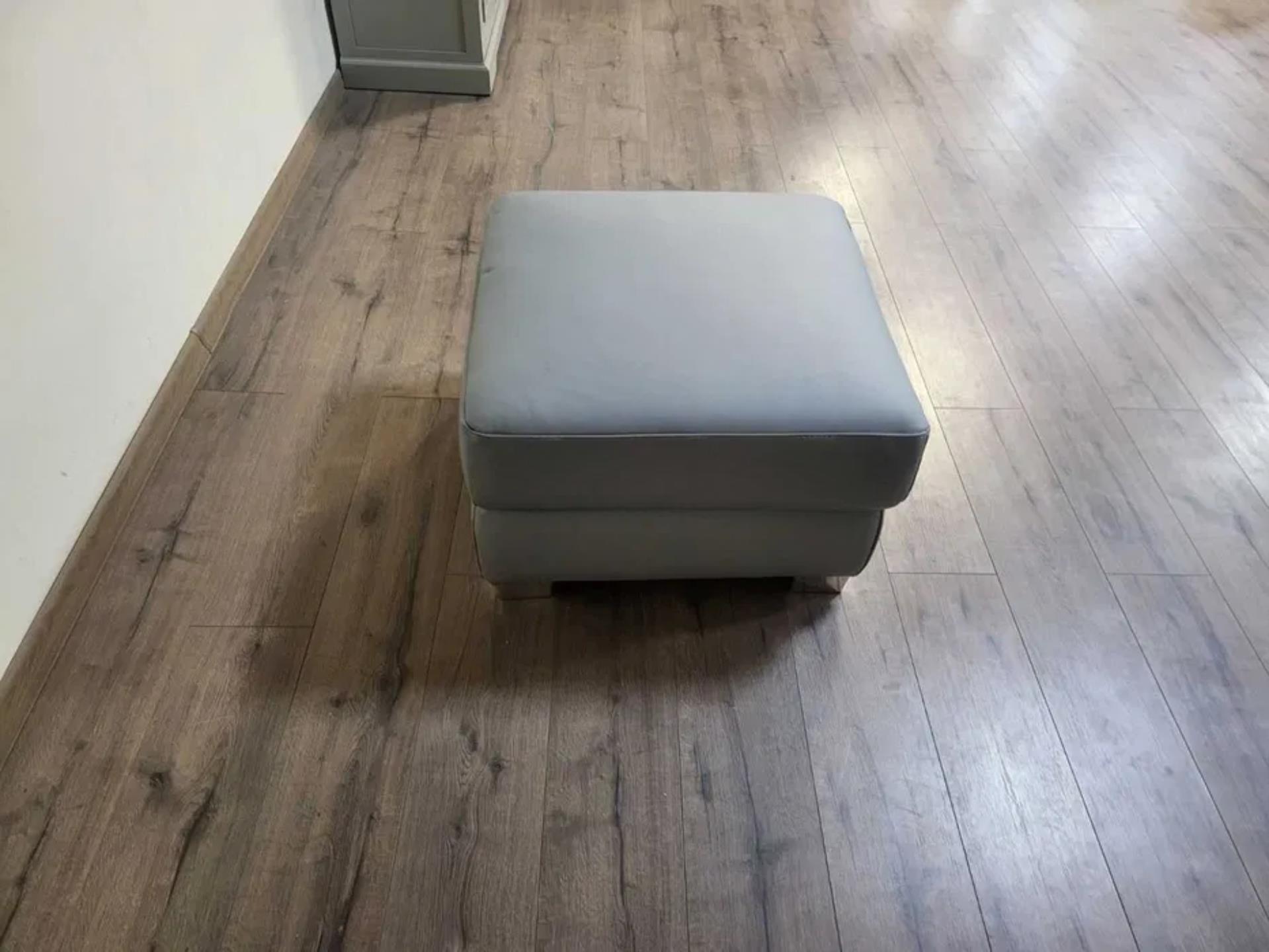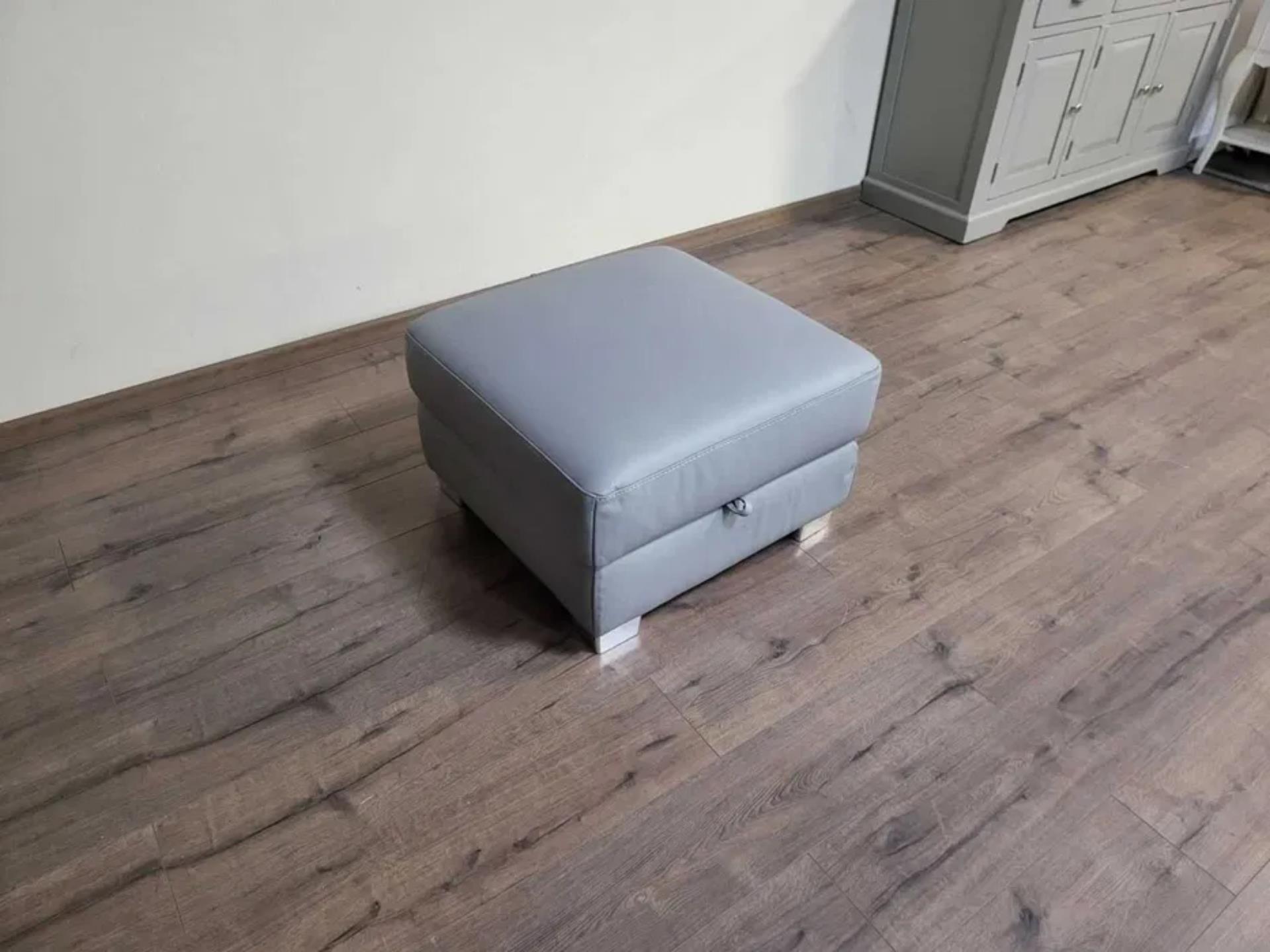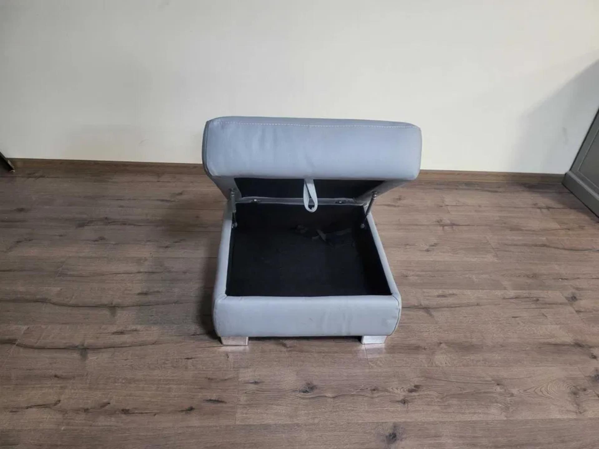 Практична сива кожена табуретка с вътрешно пространство за съхранение. Подходящ за дома или офиса, може да се използва като допълнителен седящ елемент или за съхранение на дребни предмети.