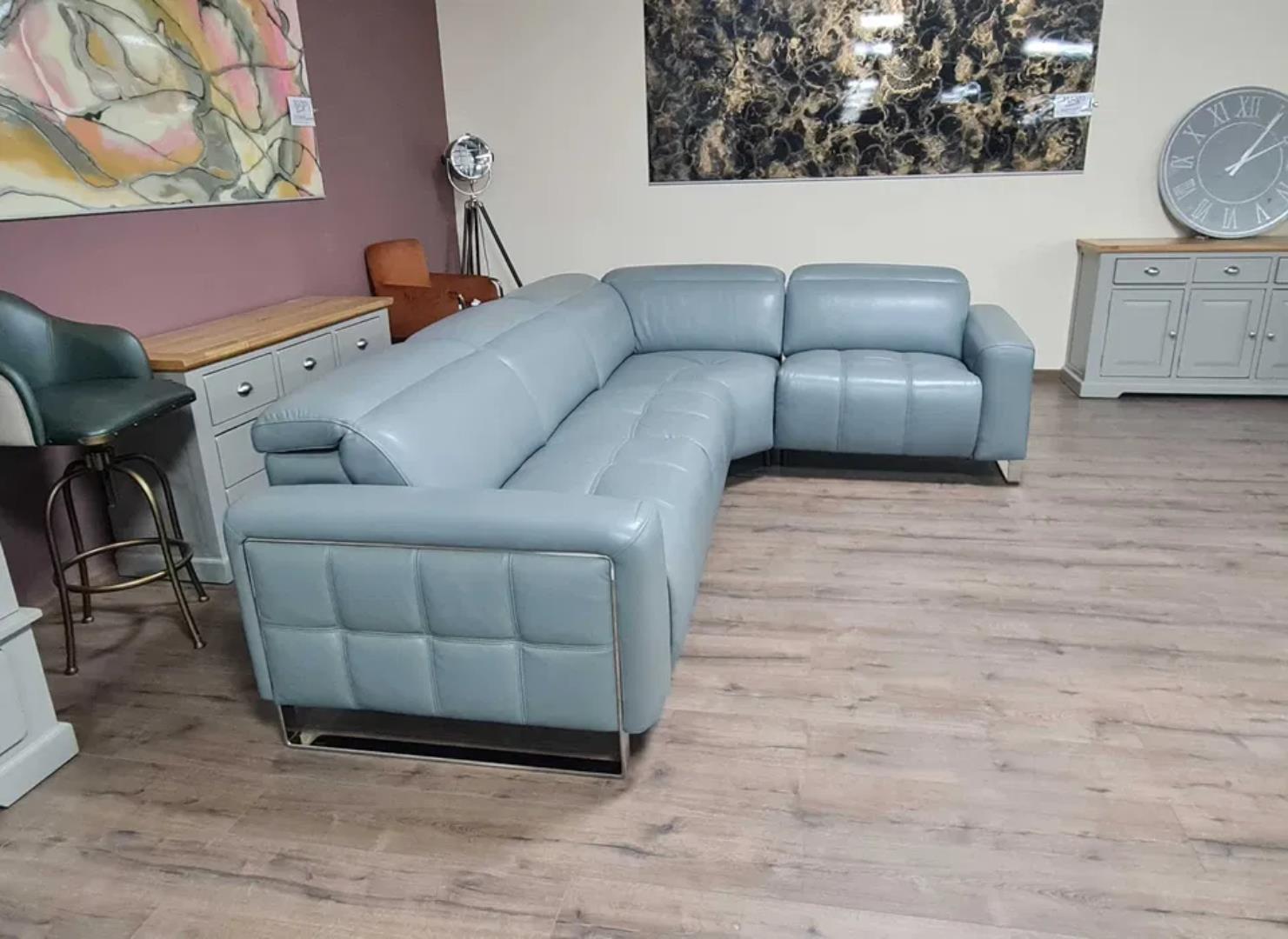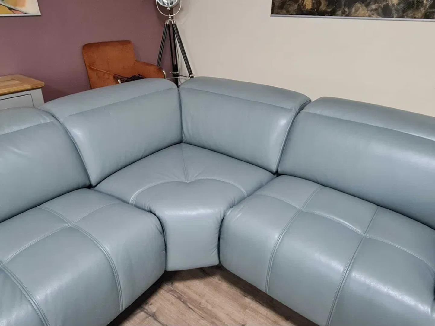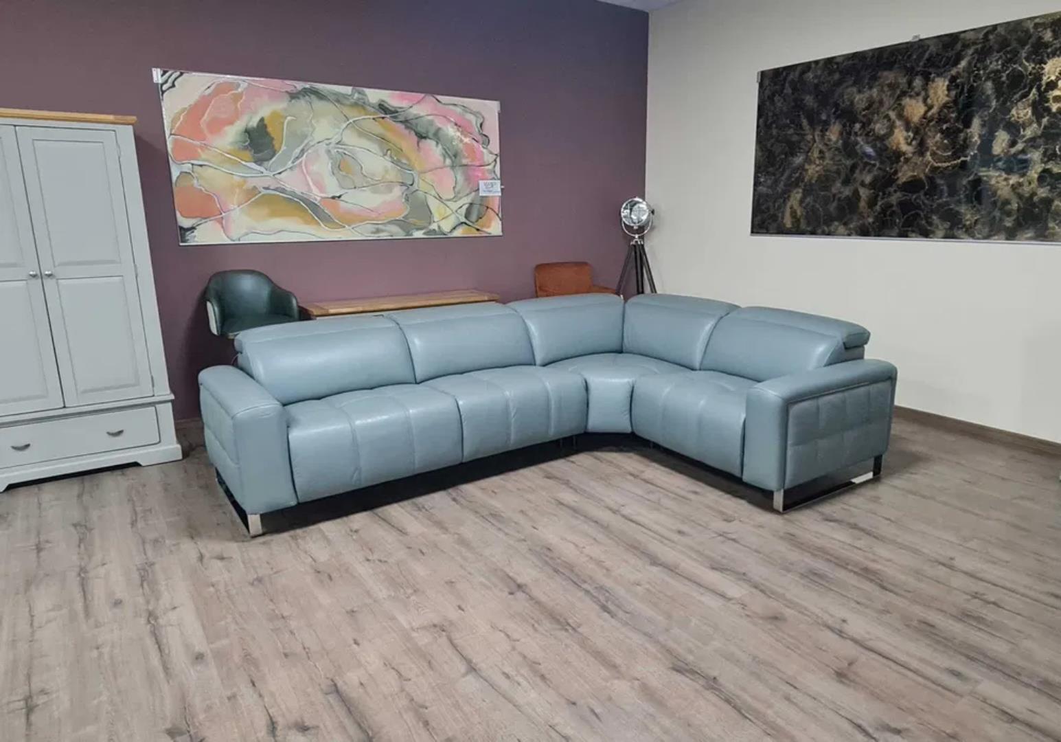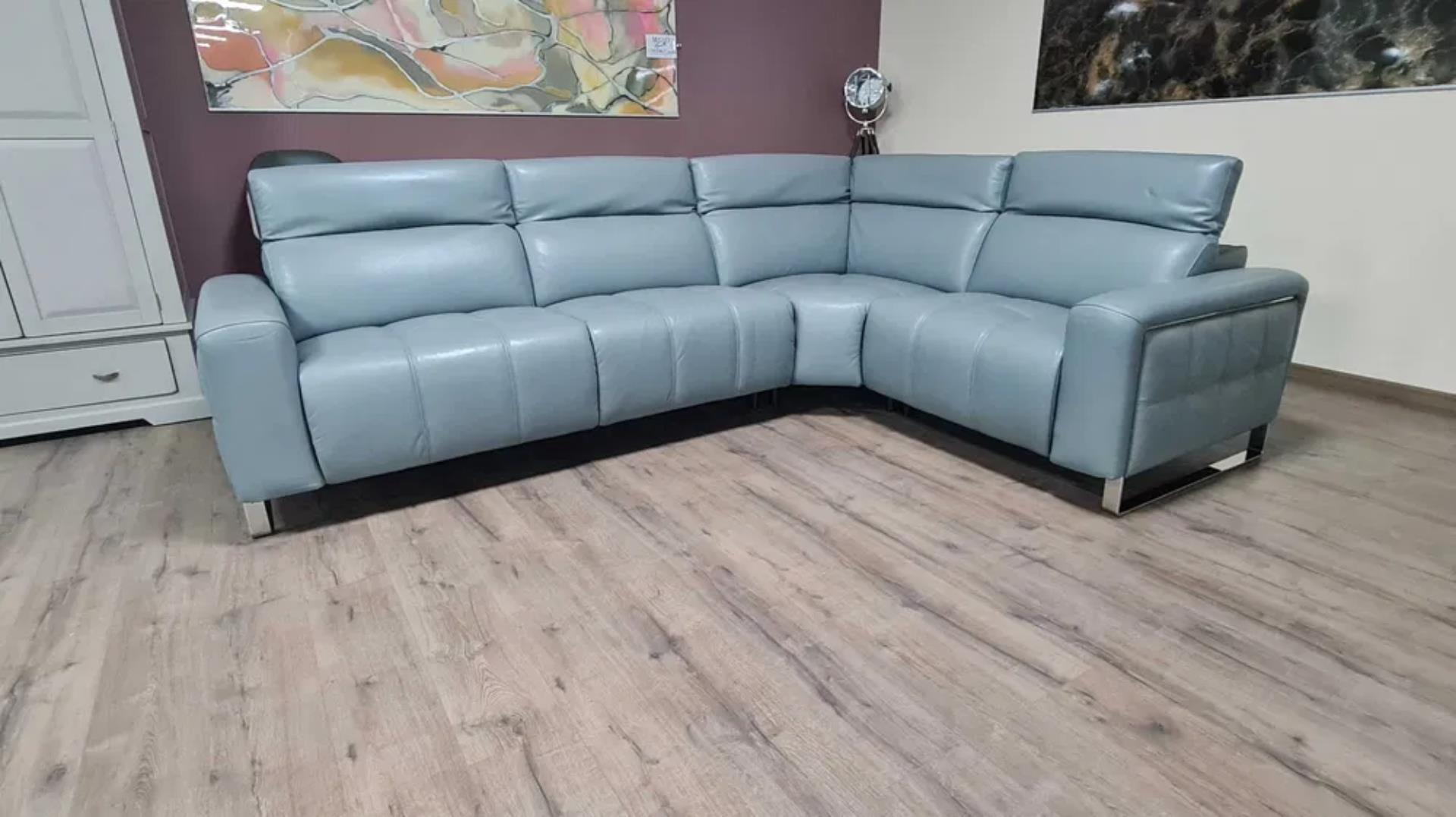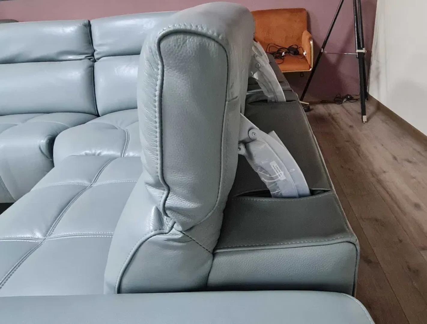 Дизайнерски Сиво – син кожен ъглов диван „Marvella“ с подвижни облегалки.