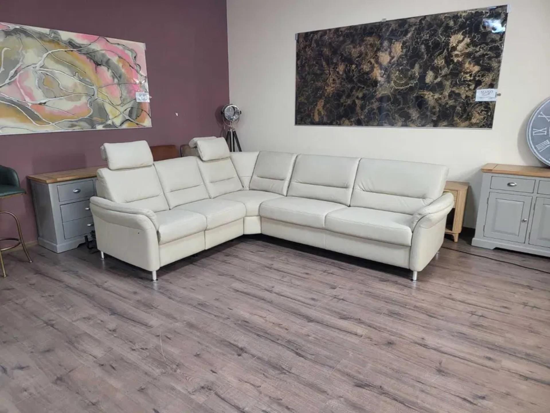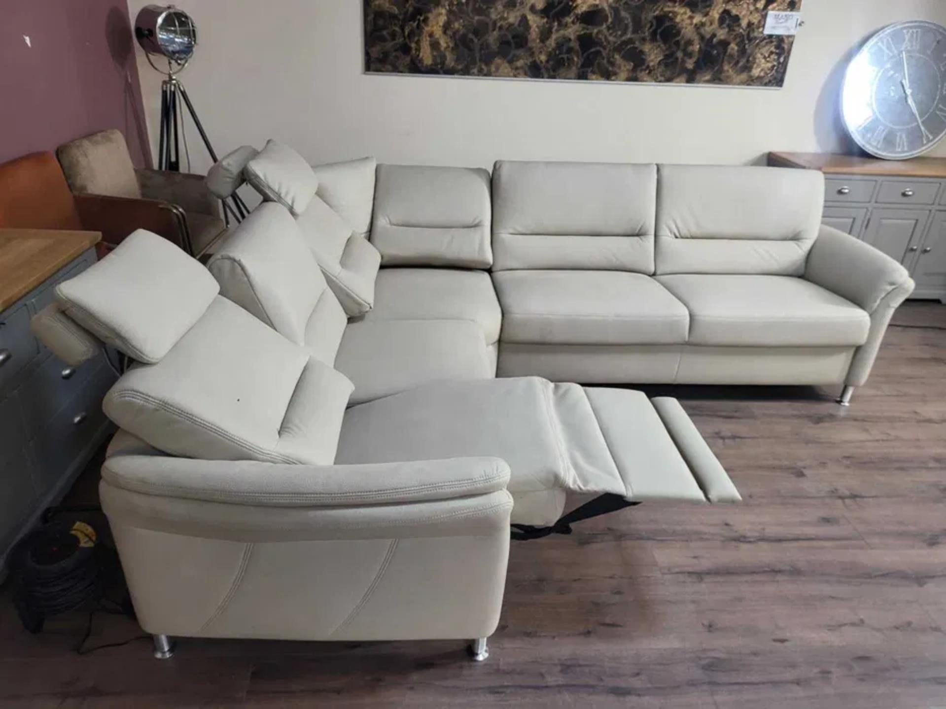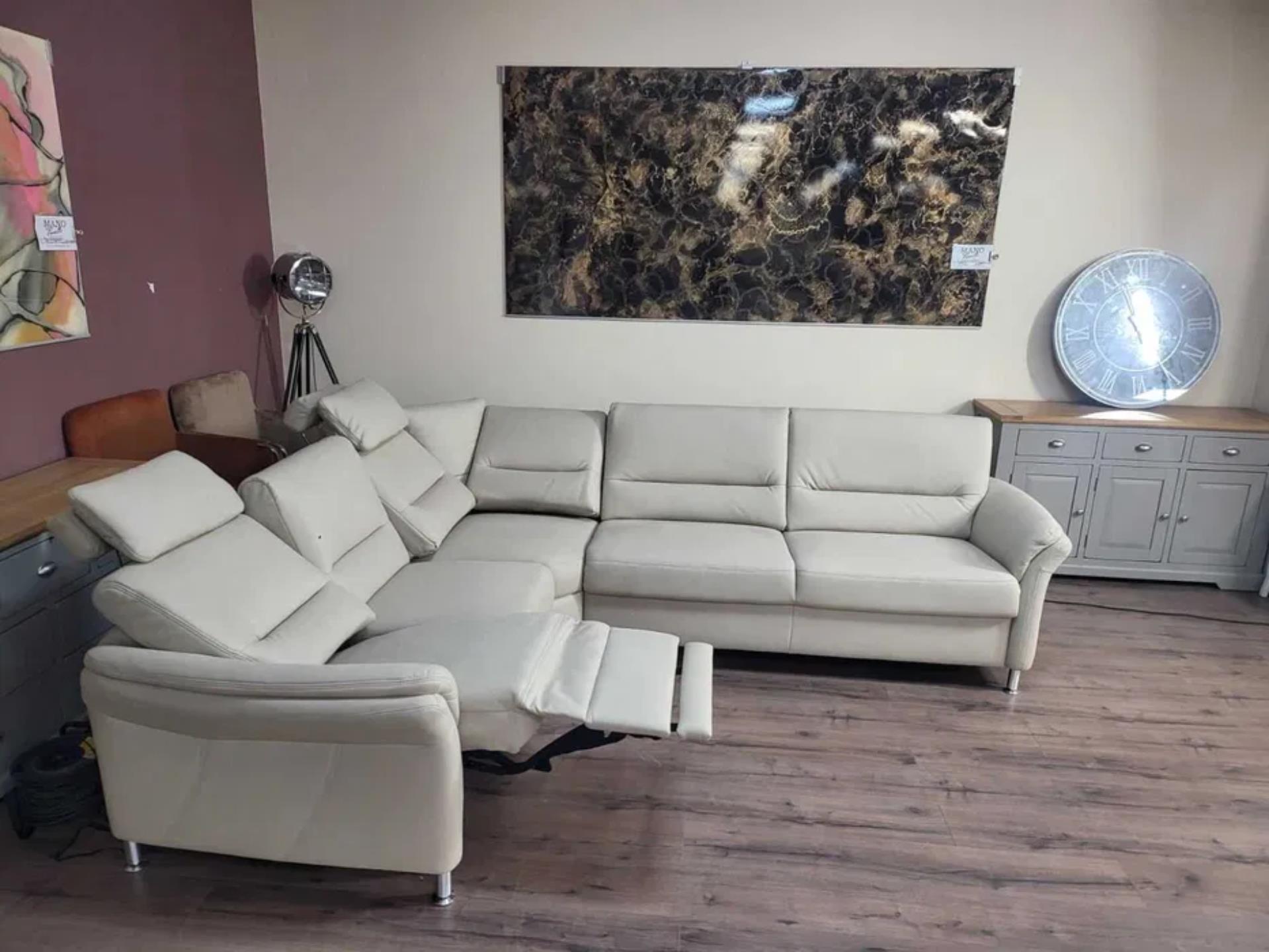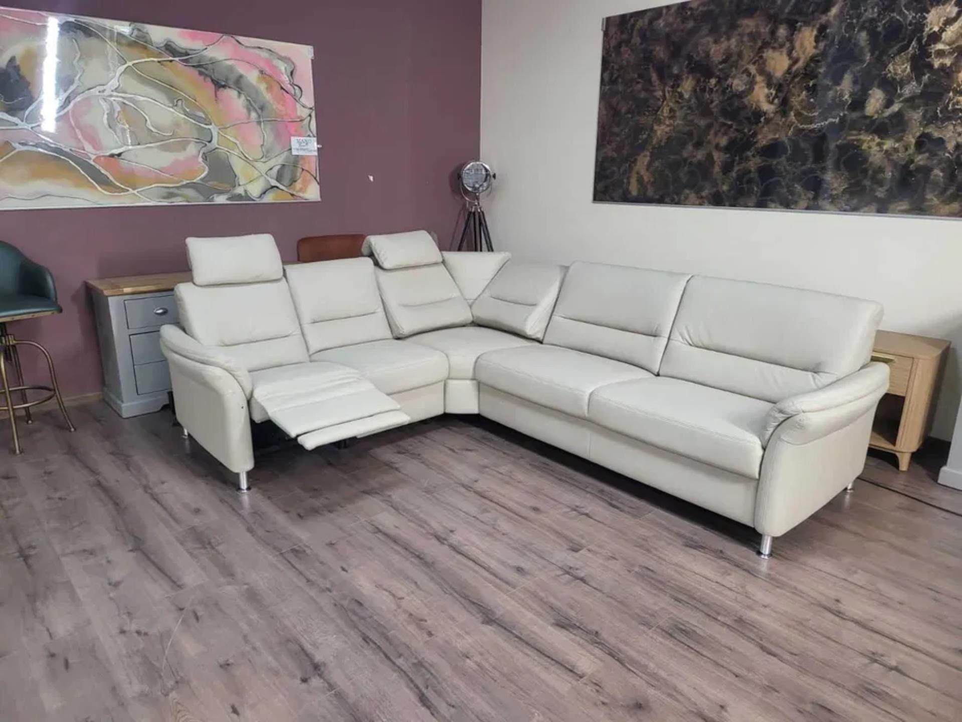 Светло кремав ъглов диван от плат Dakar с електрически релаксиращ механизъм за краката на едната крайна седалка и подвижни облегалки на ъгловата част.