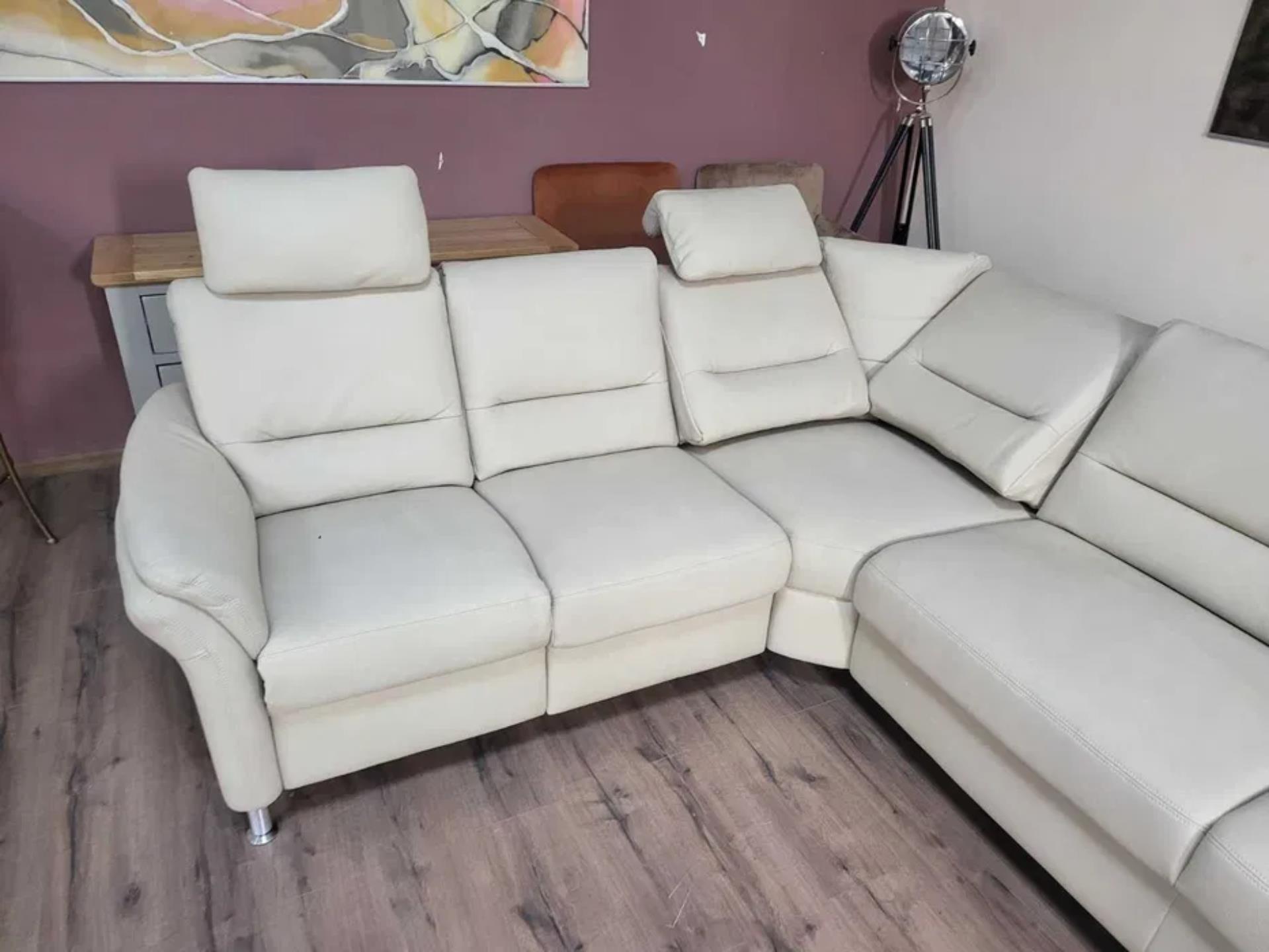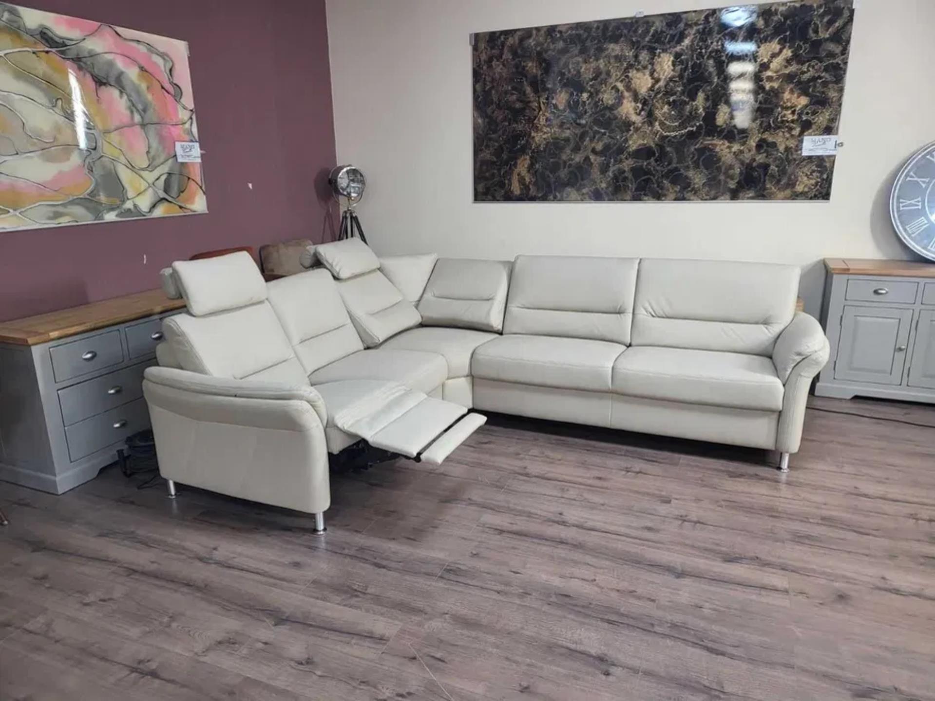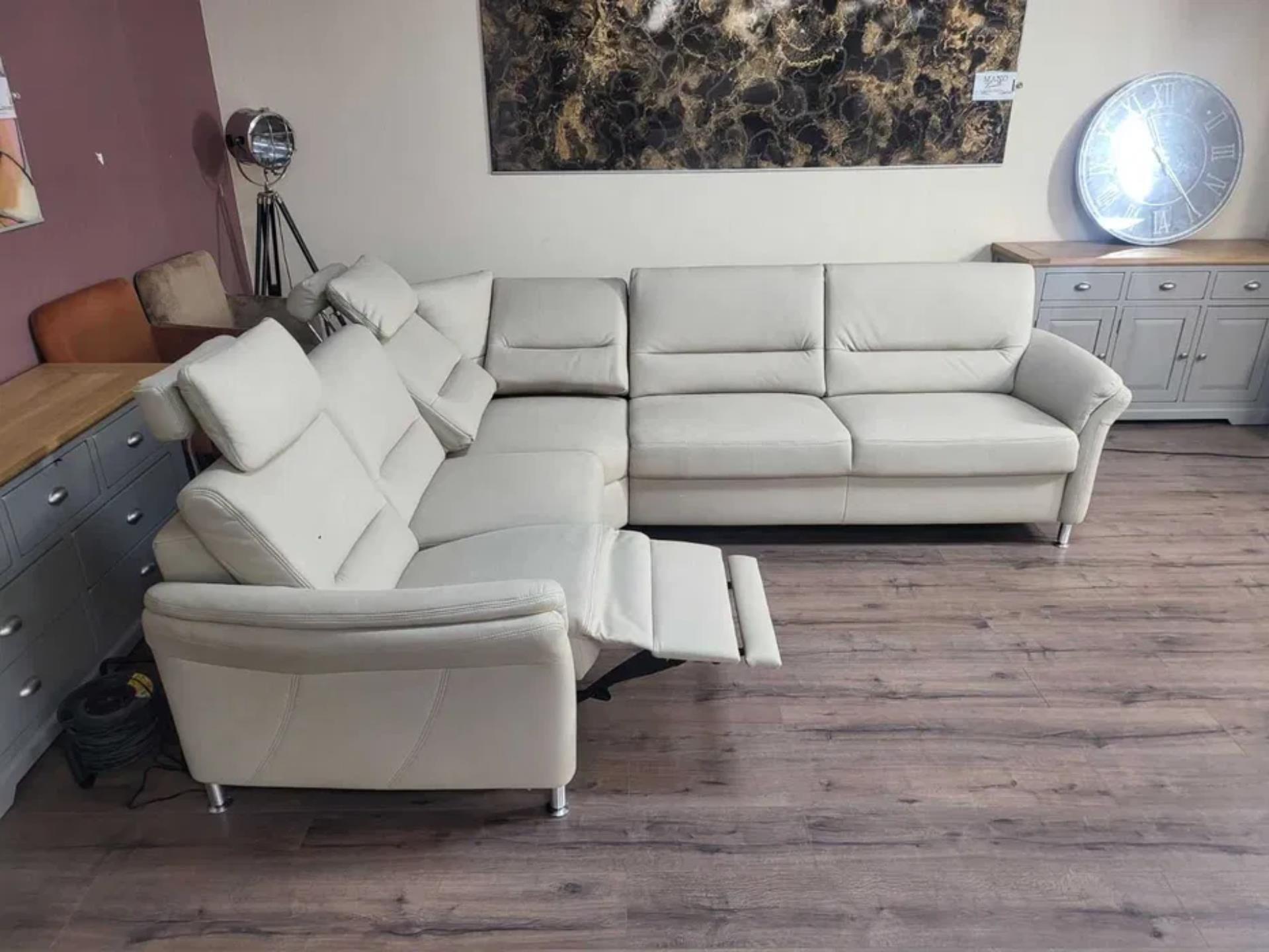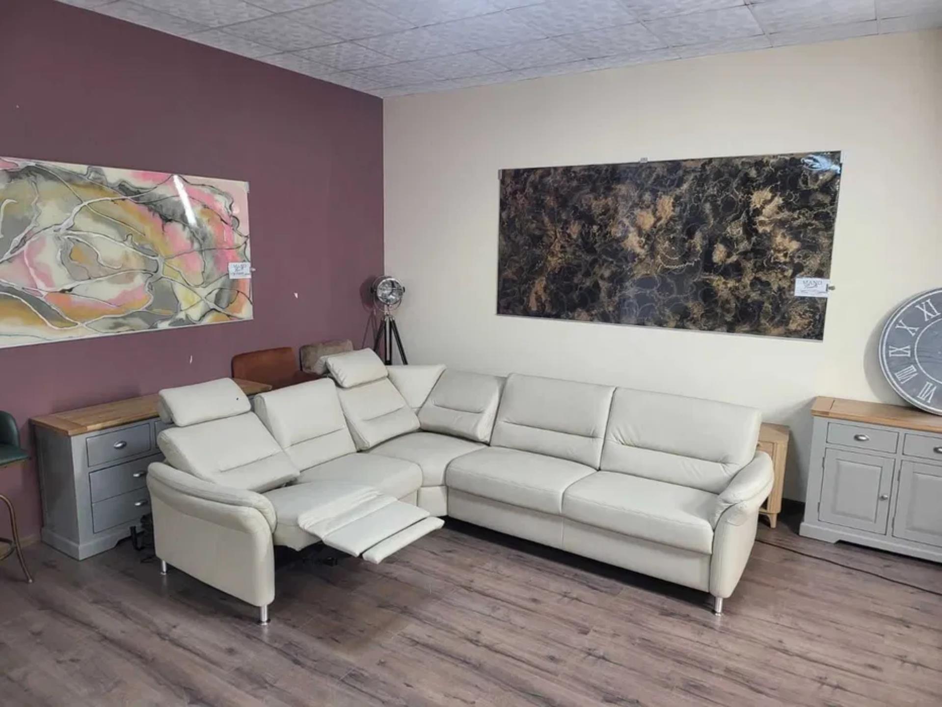 Светло кремав ъглов диван от плат Dakar с електрически релаксиращ механизъм за краката на едната крайна седалка и подвижни облегалки на ъгловата част.