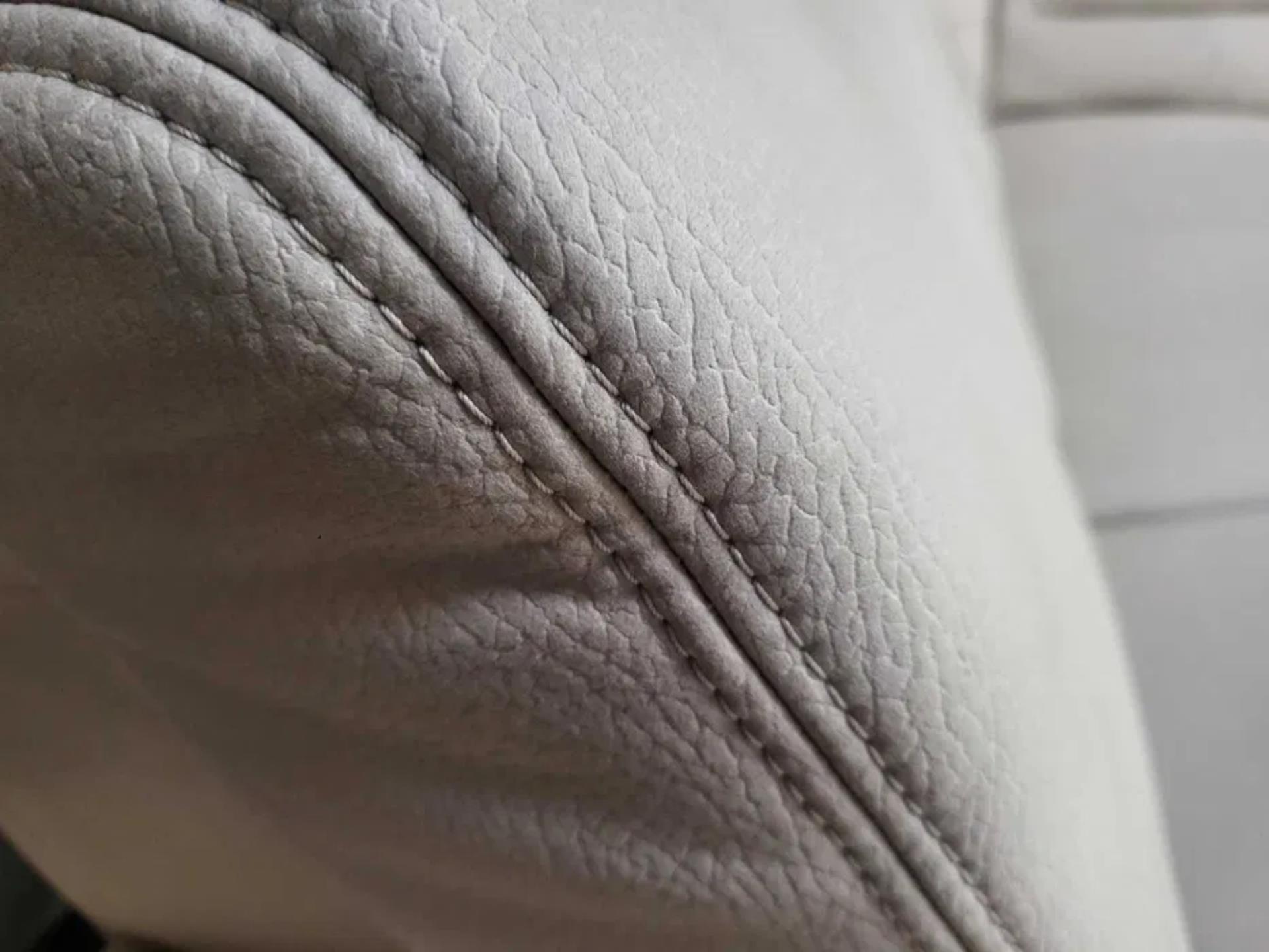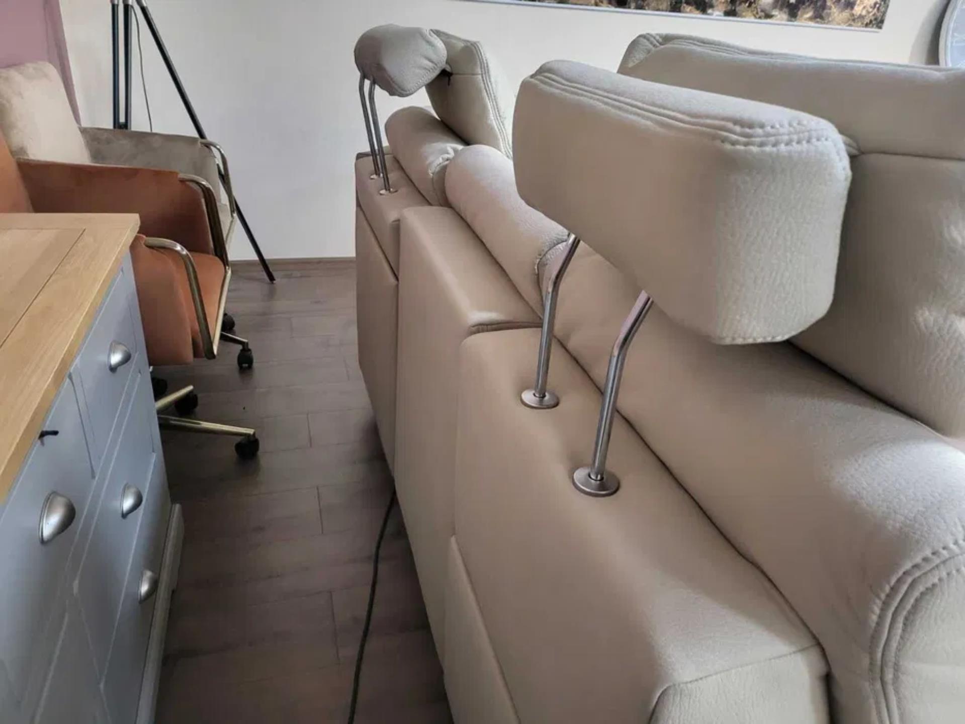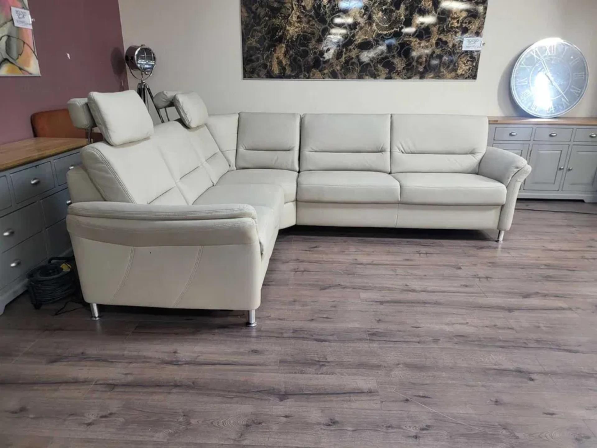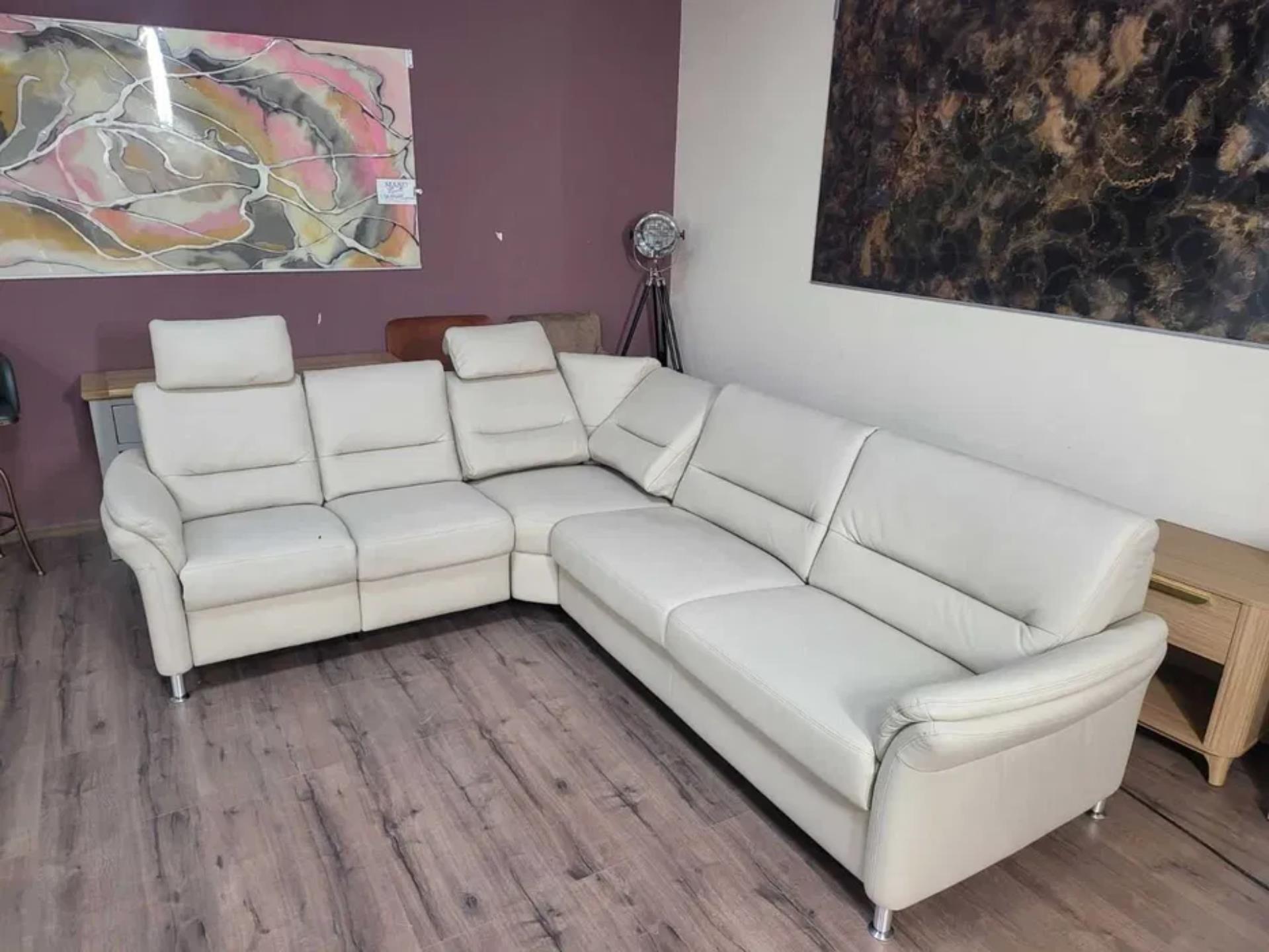 Светло кремав ъглов диван от плат Dakar с електрически релаксиращ механизъм за краката на едната крайна седалка и подвижни облегалки на ъгловата част.