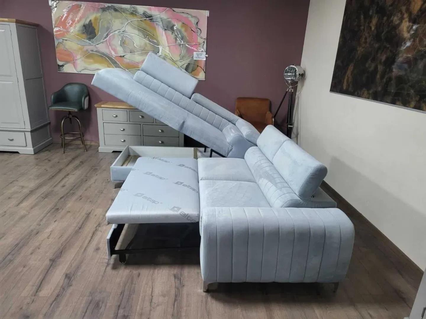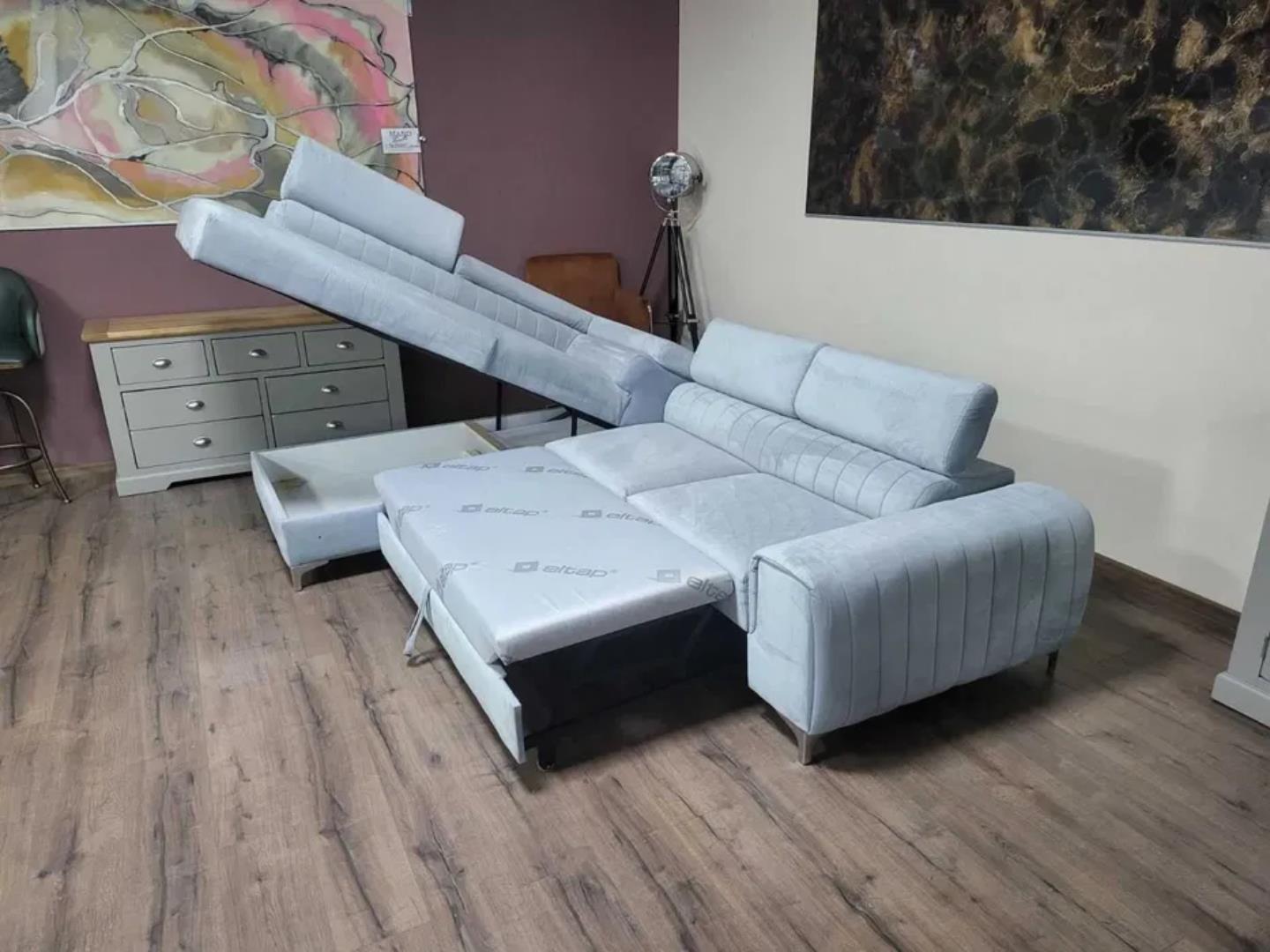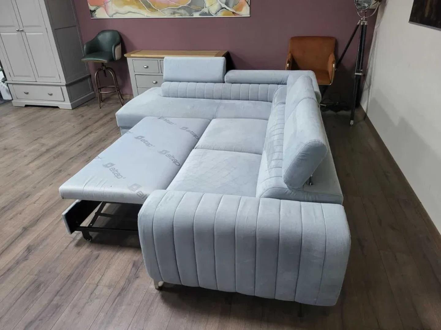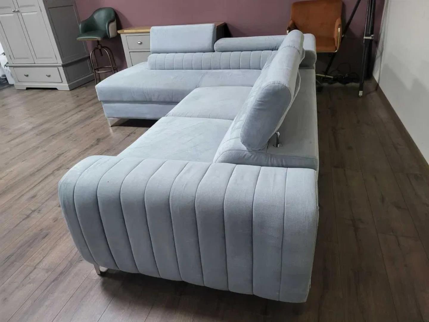 Светло син ъглов диван от плат с функция сън и ракла