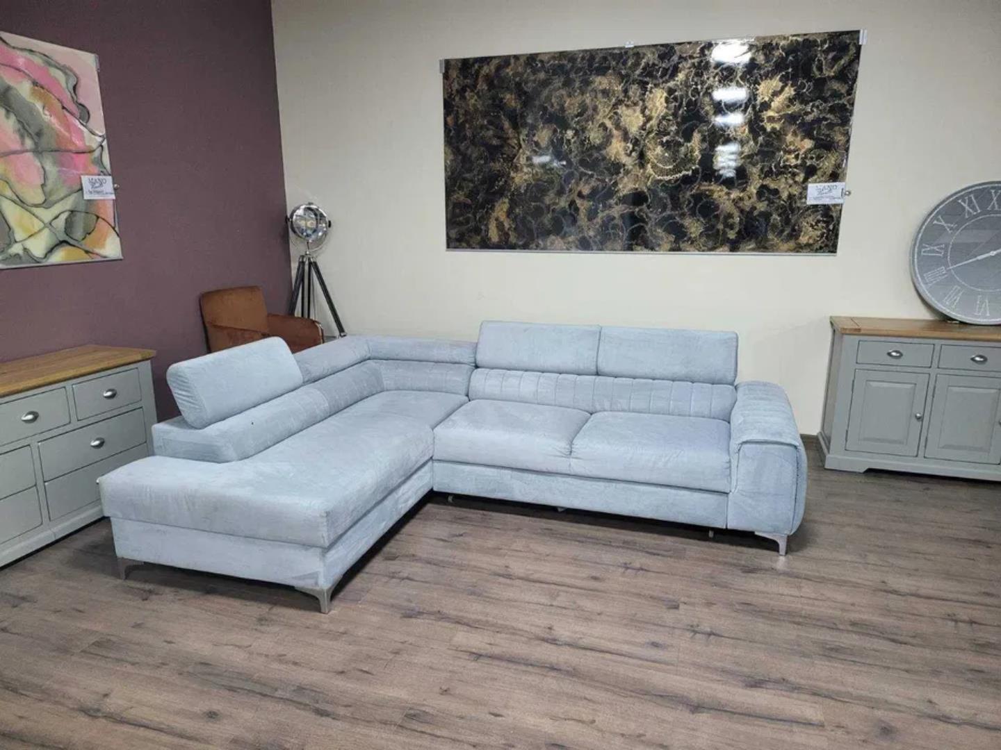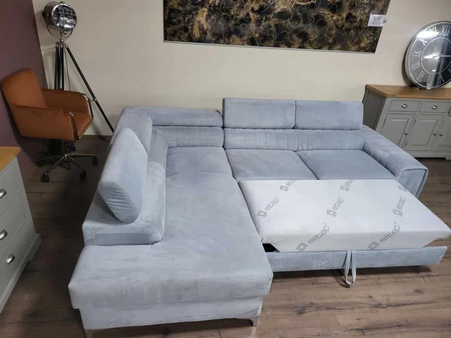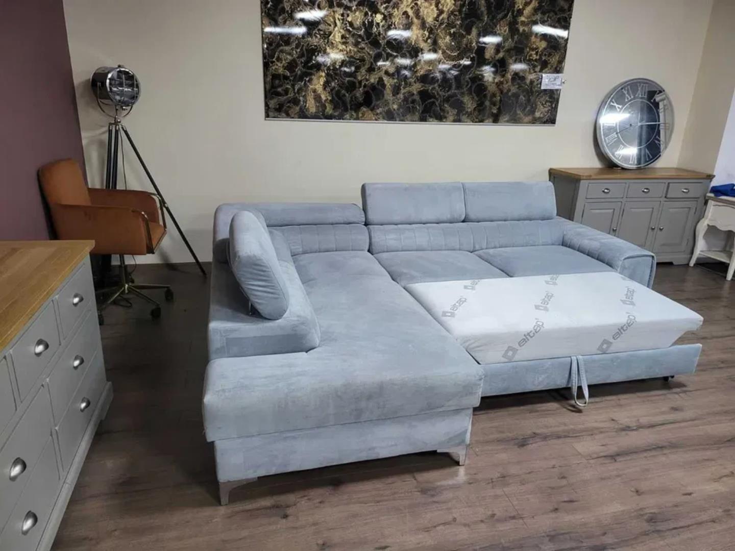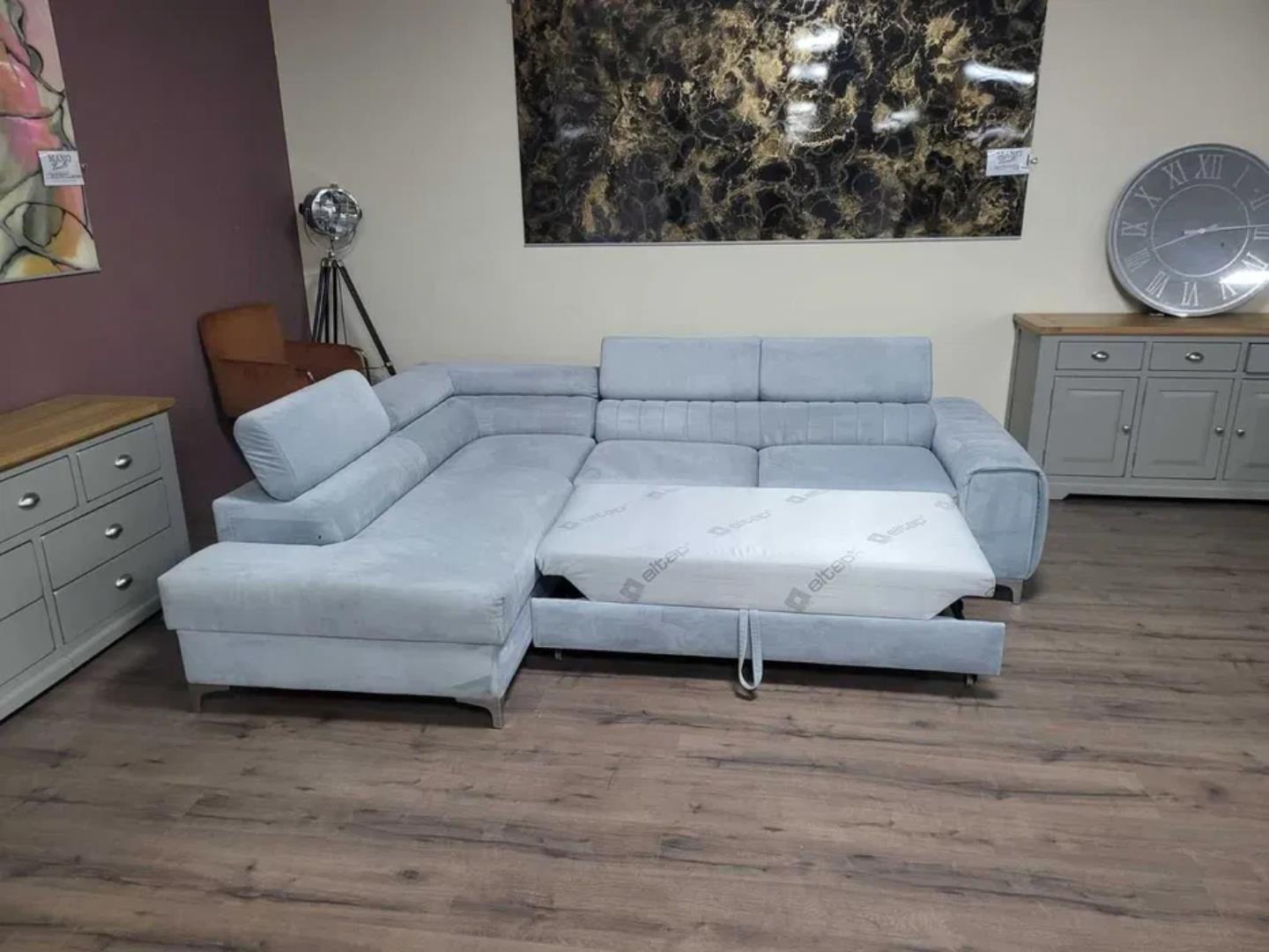 Светло син ъглов диван от плат с функция сън и ракла