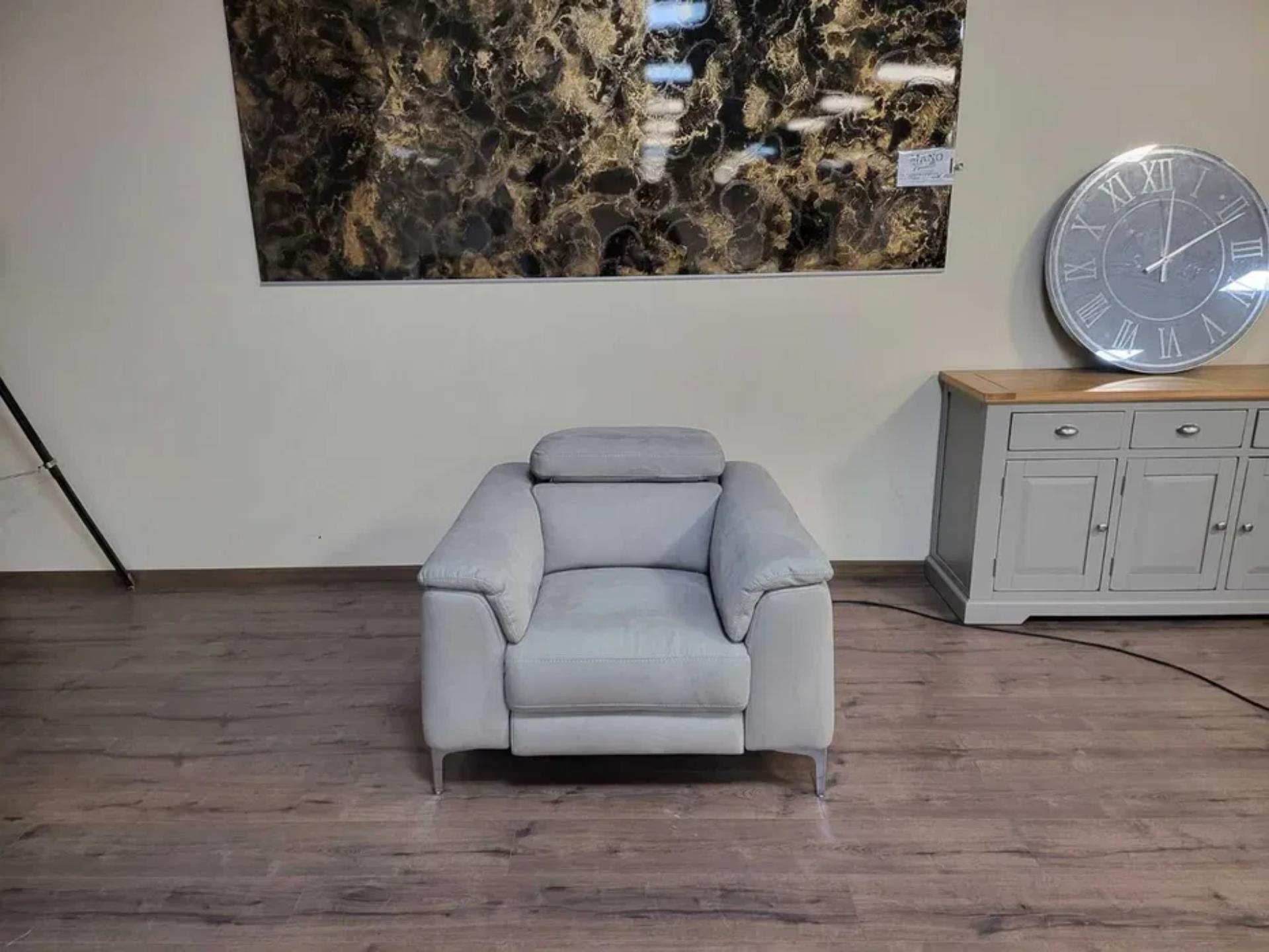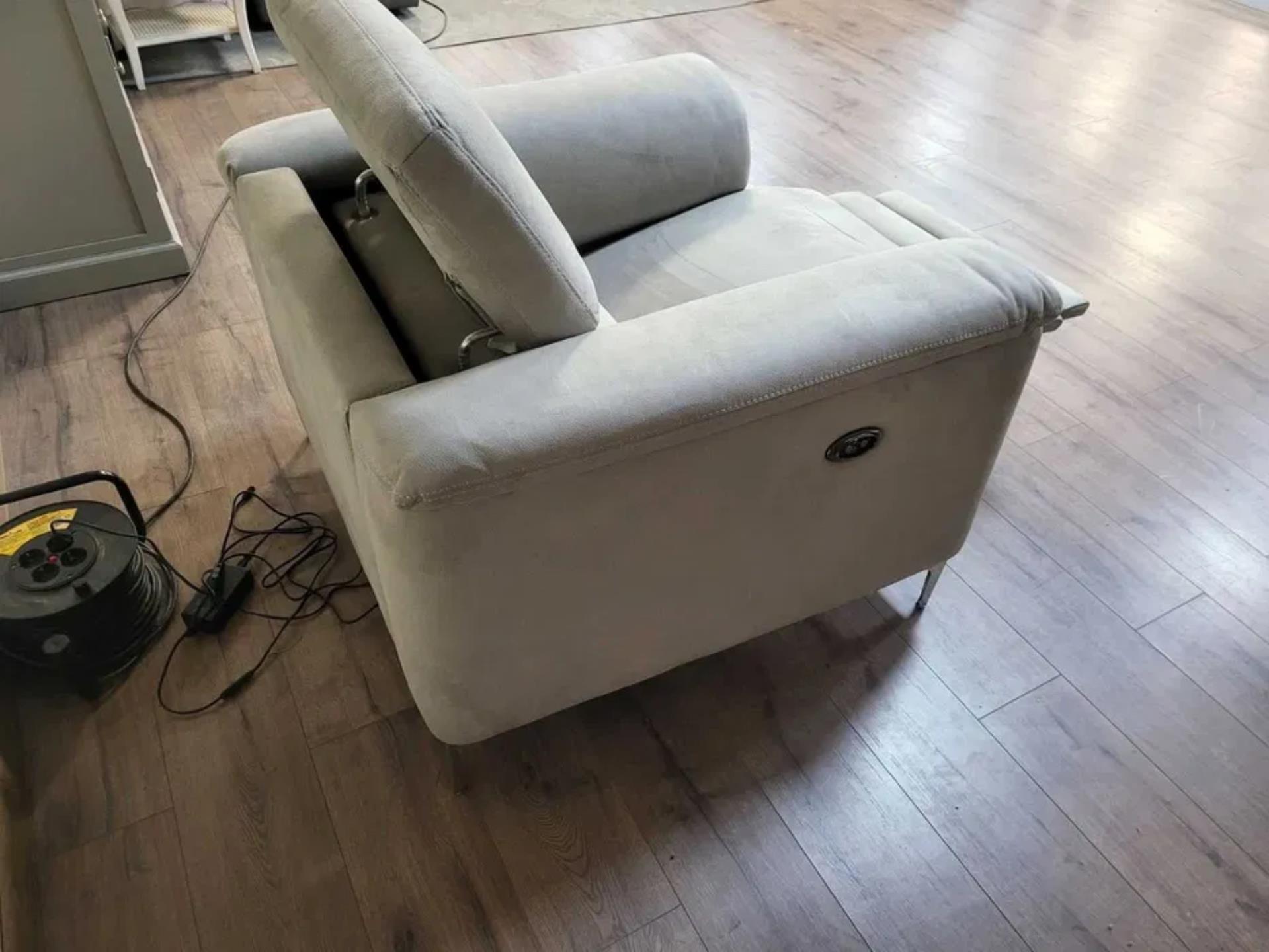 Светло сив фотьойл от плат с електрически релаксиращ механизъм за краката и подвижна облегалка.