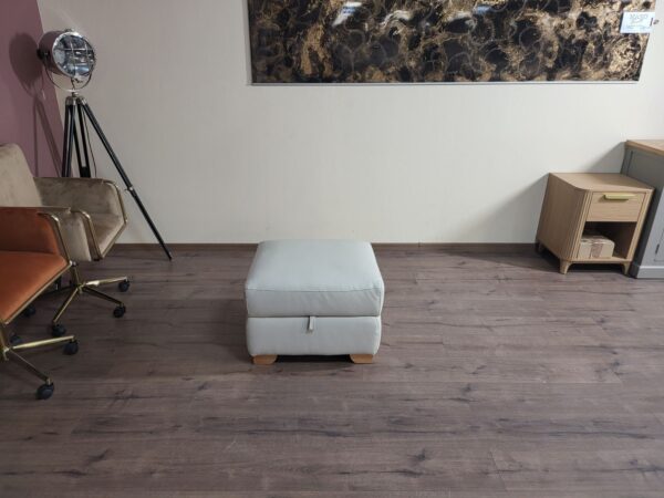 Светло сива табуретка от плат тип Честърфийлд.