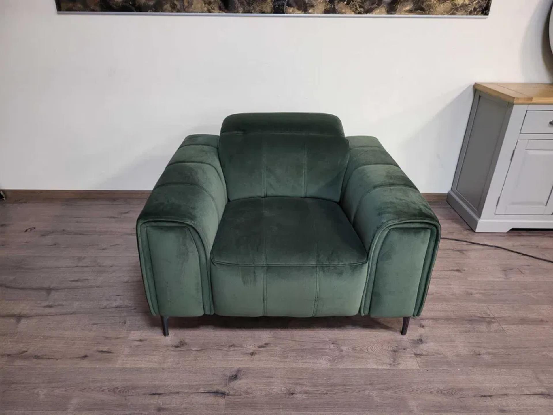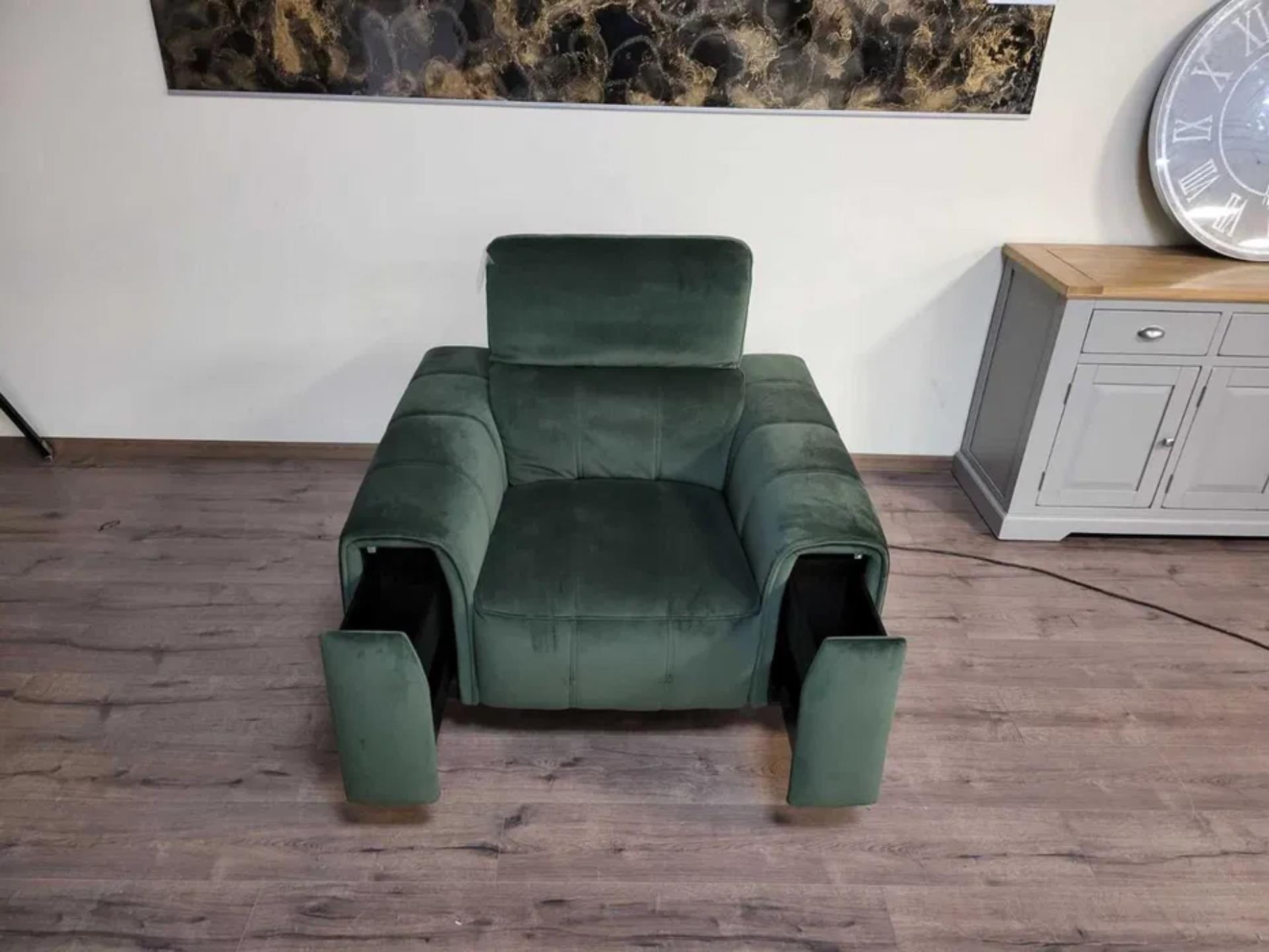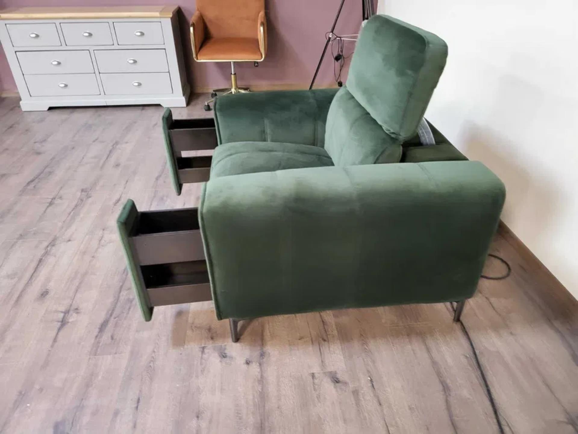Зелен фотьойл от плат с електрически релаксиращ механизъм за краката и подвижни облегалки. Има чекмеджета на двата подлакътника.