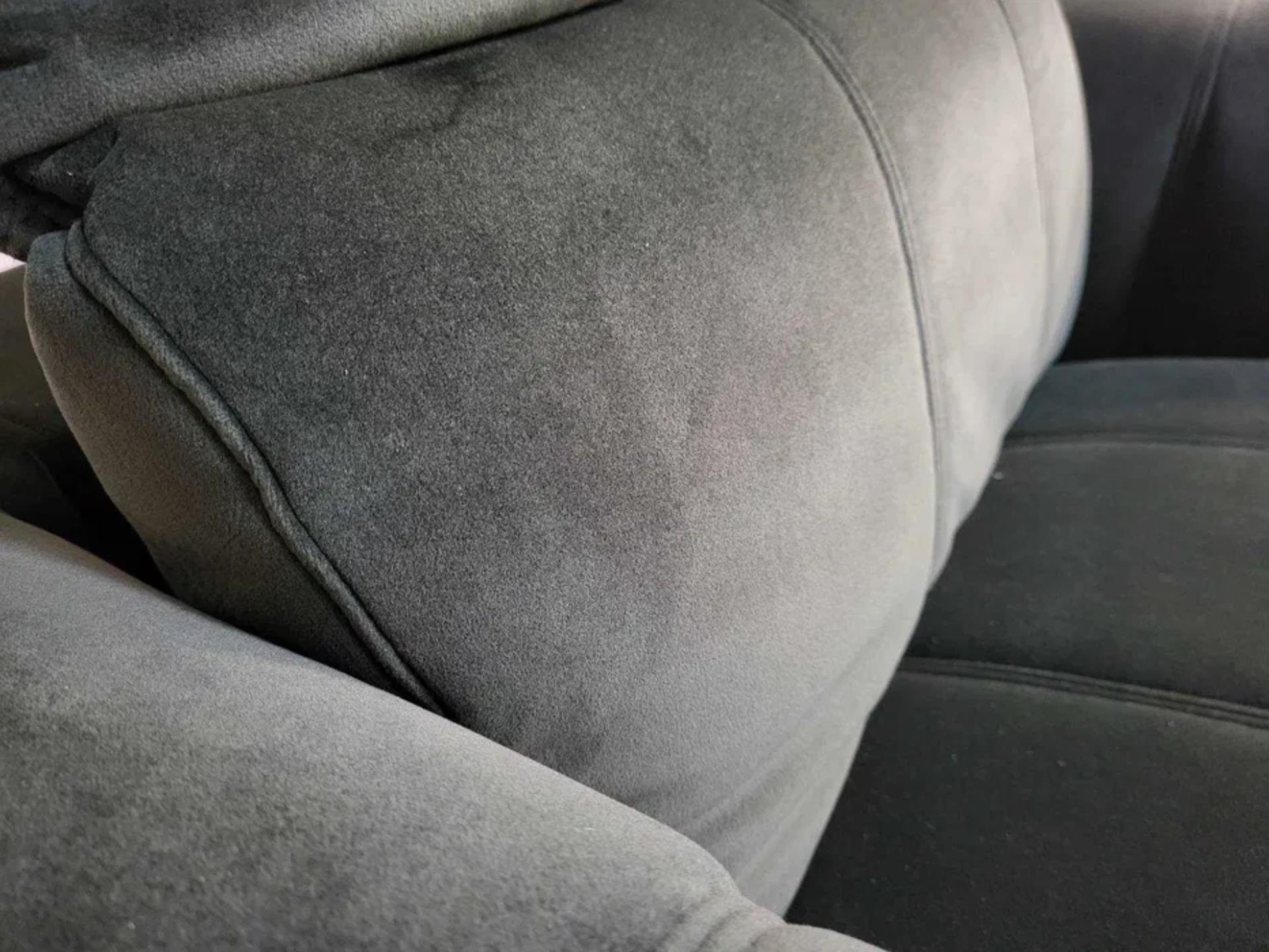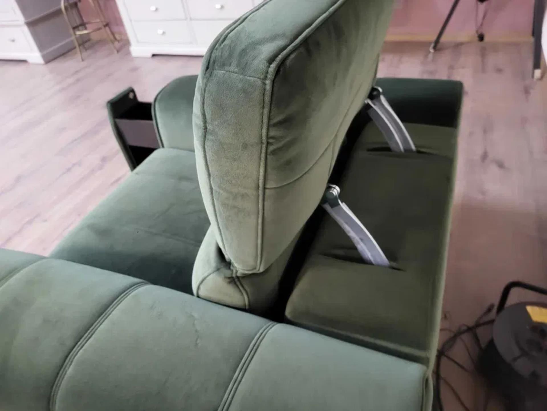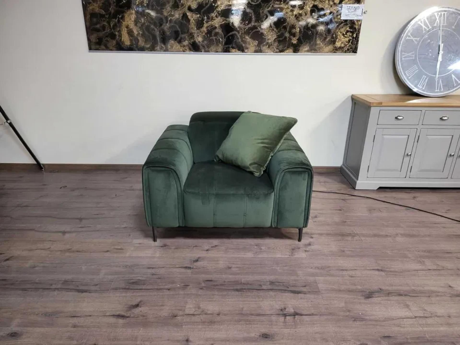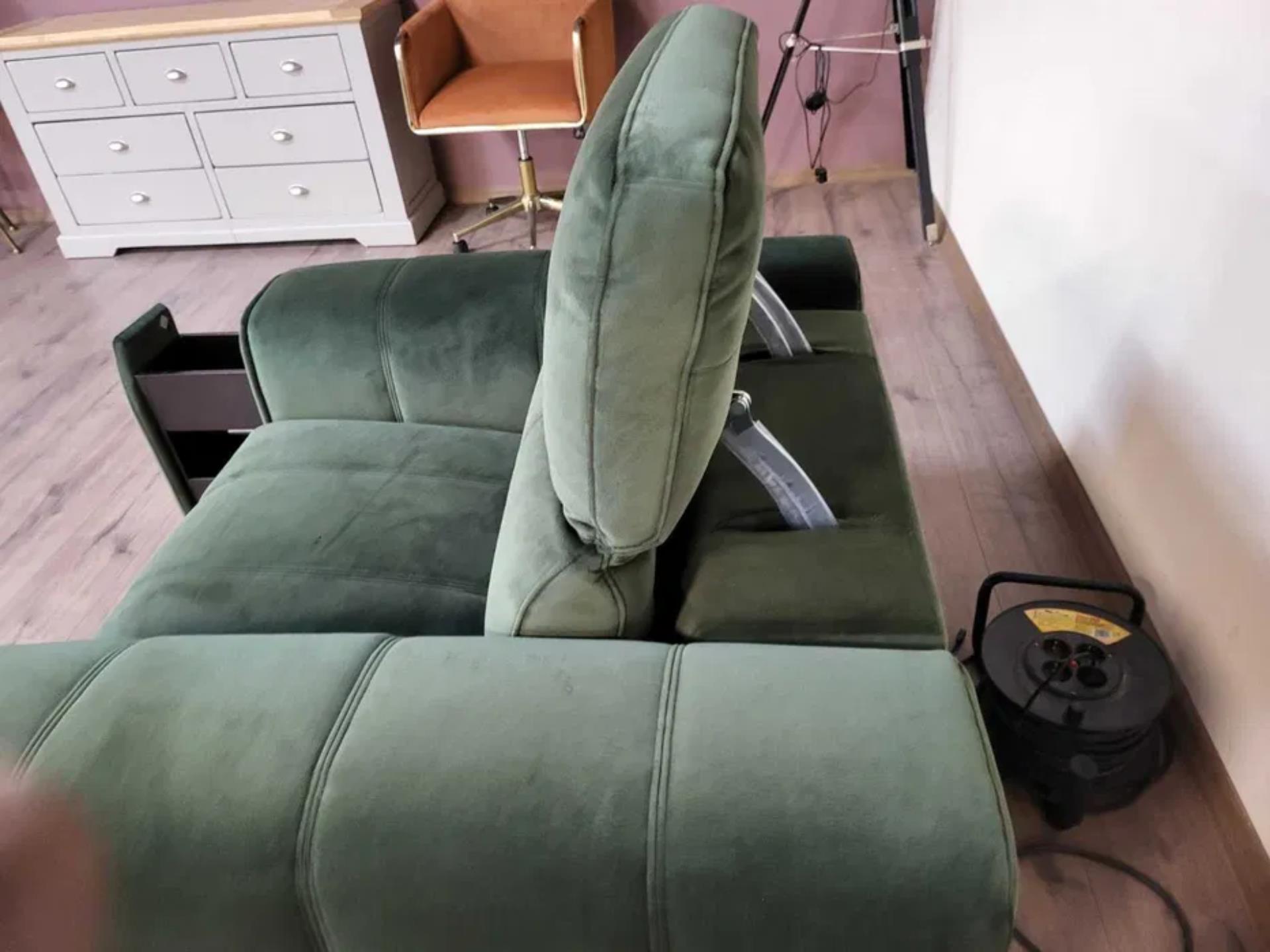Зелен фотьойл от плат с електрически релаксиращ механизъм за краката и подвижни облегалки. Има чекмеджета на двата подлакътника.